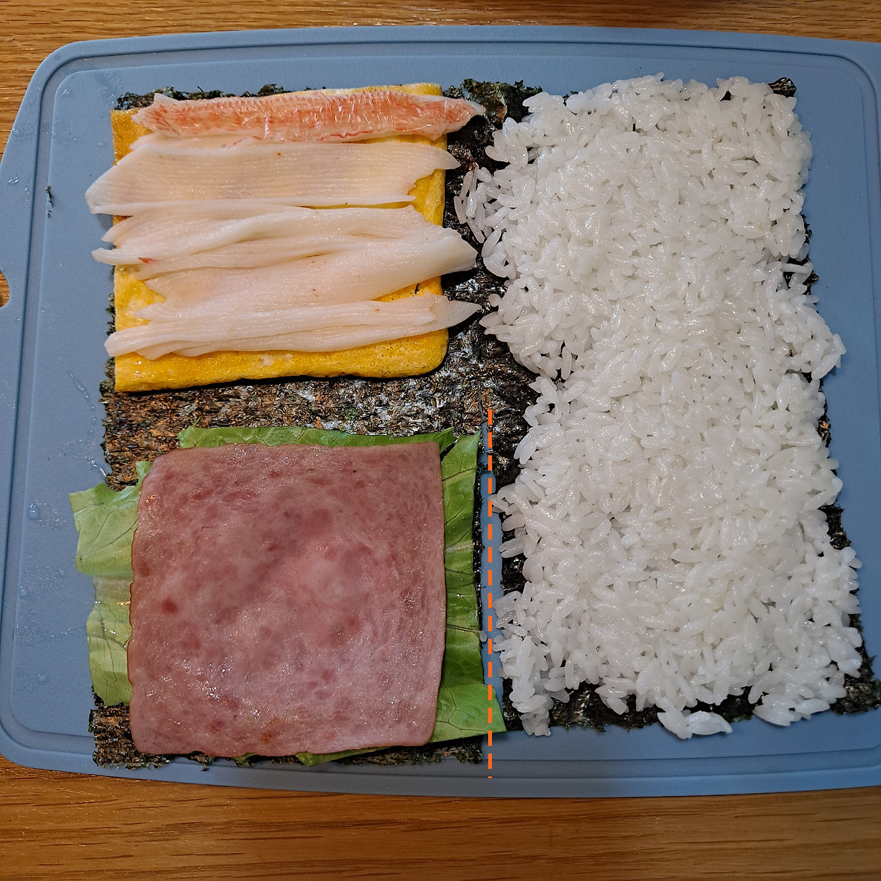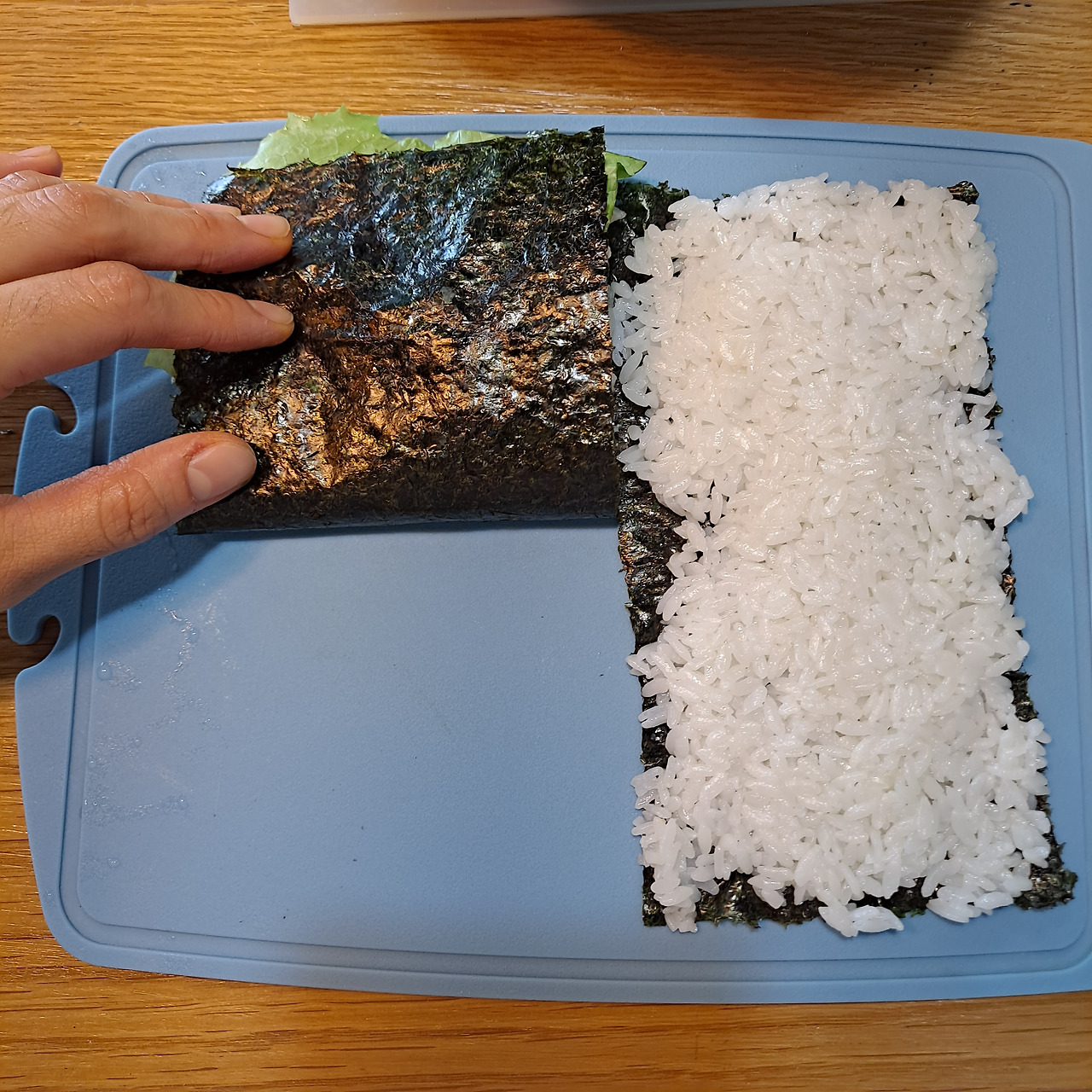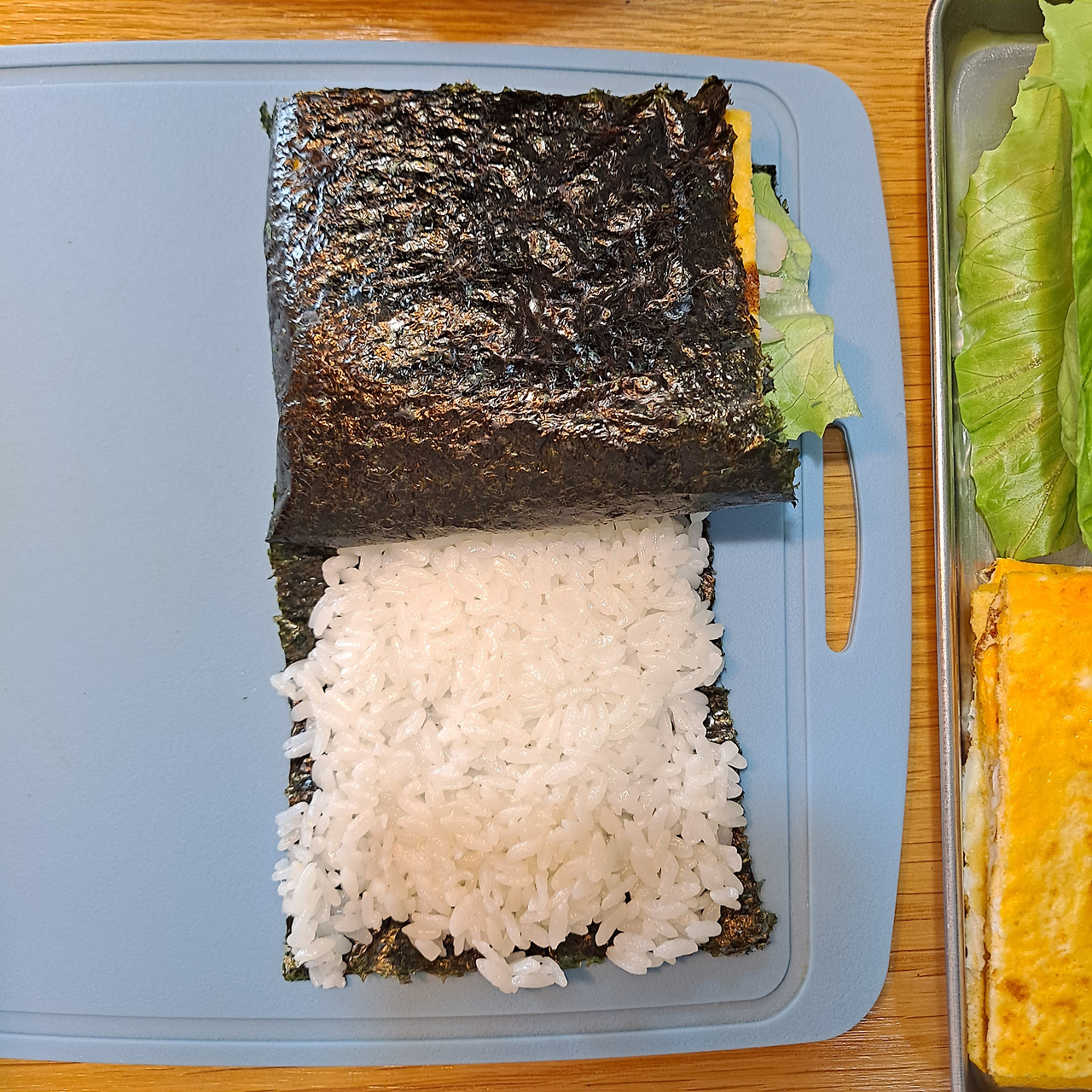 SNS을 핫하게 달구웠던 레시피가 있으니, 바로 접어먹는 김밥이다. 샌드위치 같기도 하고, 햄버거 같기도 하고, 김밥 같기도 한 이 오묘함을 어찌 표현해야 할지. 김의 중앙 하단을 가위로 자르고, 왼편에는 재료들을 오른편에는 밥을 깔아준다. 재료는 햄, 계란, 상추, 크랩을 넣었는데 취향에 따라 치즈, 참치 등을 추가해도 괜찮다.