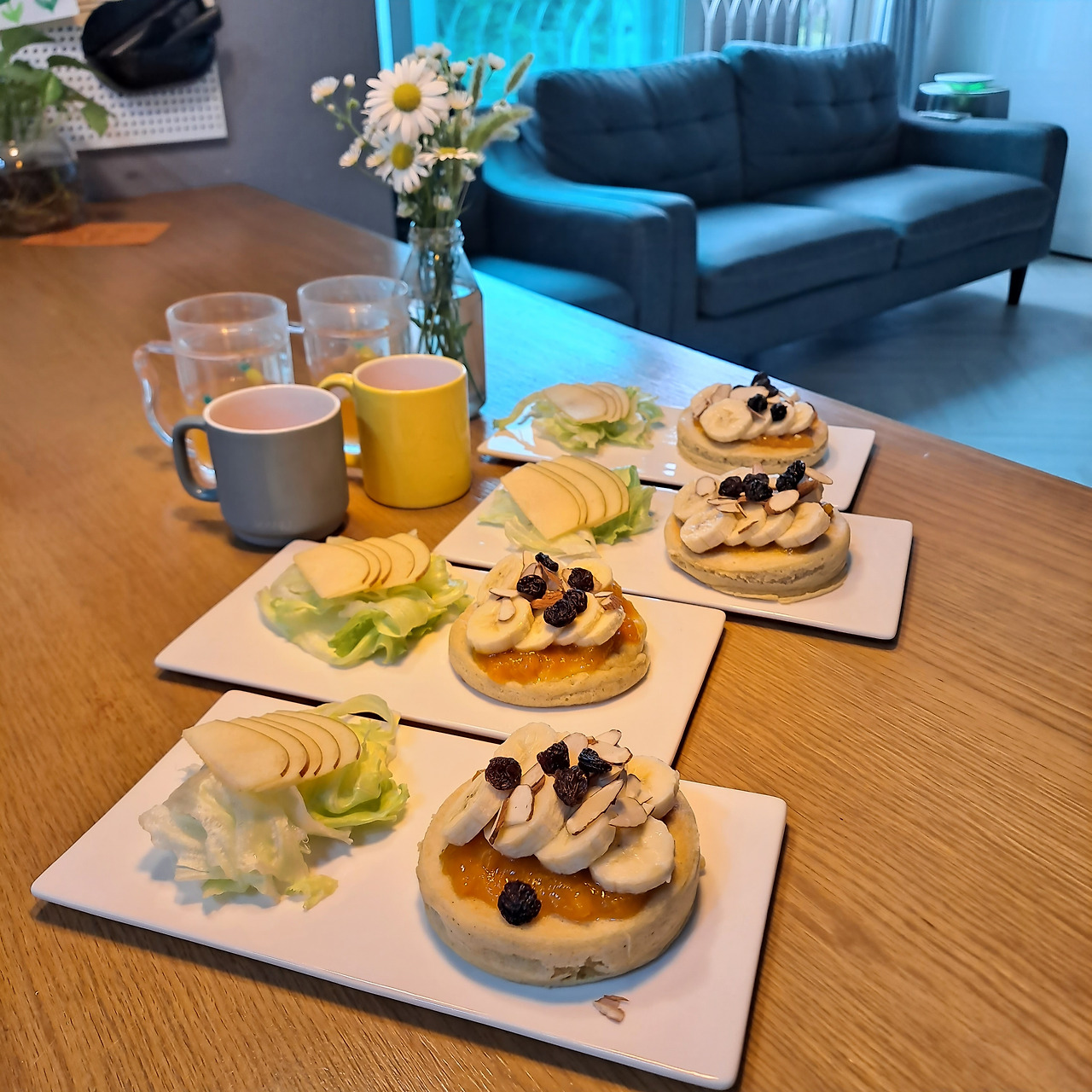 팬케이크 믹스와 우유(혹은 두유), 그리고 계란만 있으면 쉽게 만들 수 있는 메뉴이다. 글루텐프리 쌀가루 팬케이크 믹스를 사용했는데 요새는 직구로도 일주일도 안 돼서 도착하니 쉽게 구할 수 있다. 이왕이면 더 예쁘게 만들 수 있는 팁을 귀띔하자면, 바로 무스링을 사용하는 것이다. 단, 사용 전에 안쪽에 넉넉하게 기름을 덧발라줘야 핫케이크를 잘 떼낼 수 있으니 참고. 생크림 혹은 잼을 바르고 과일이나 견과류로 장식하면 브런치 카페 못지않은 비주얼이 완성된다.