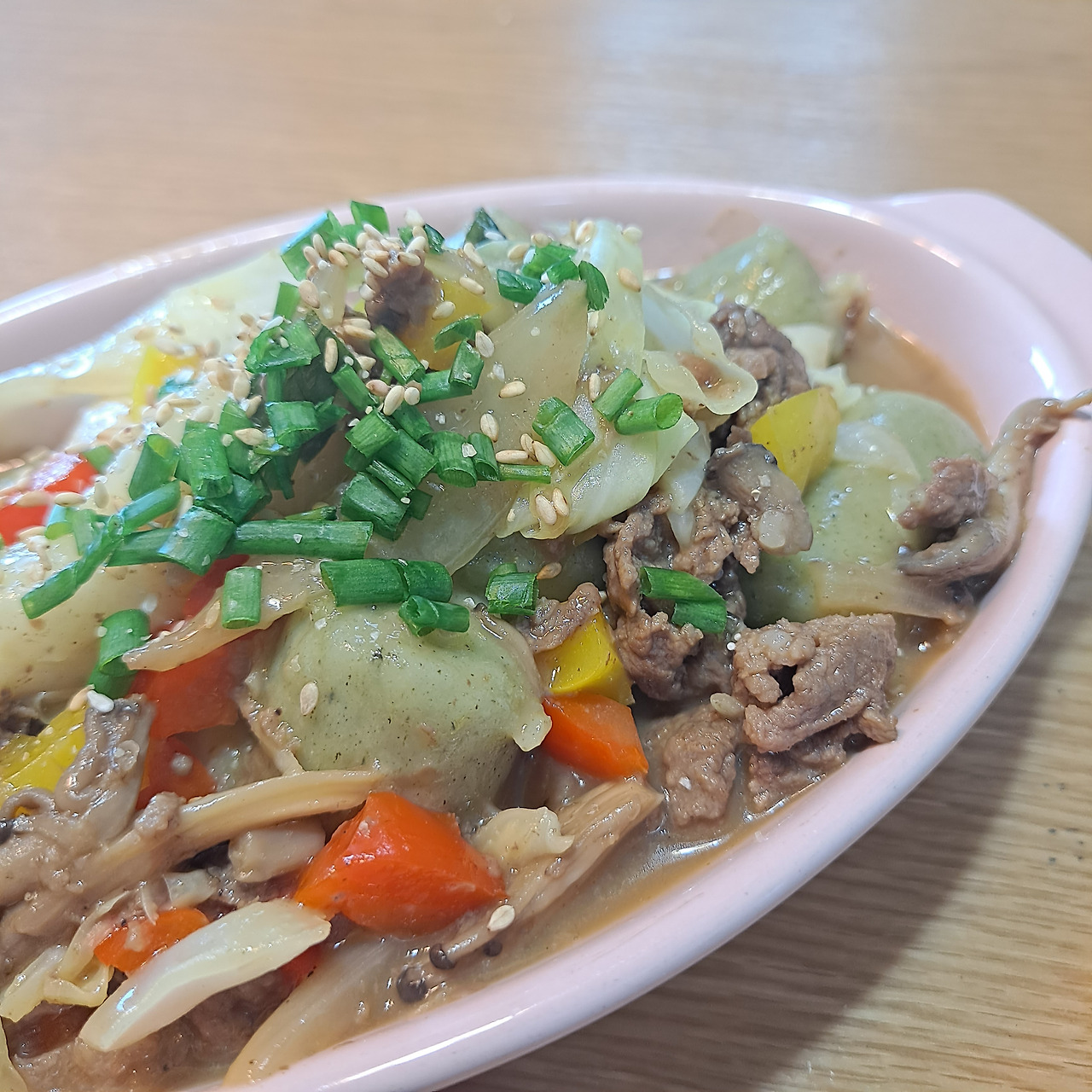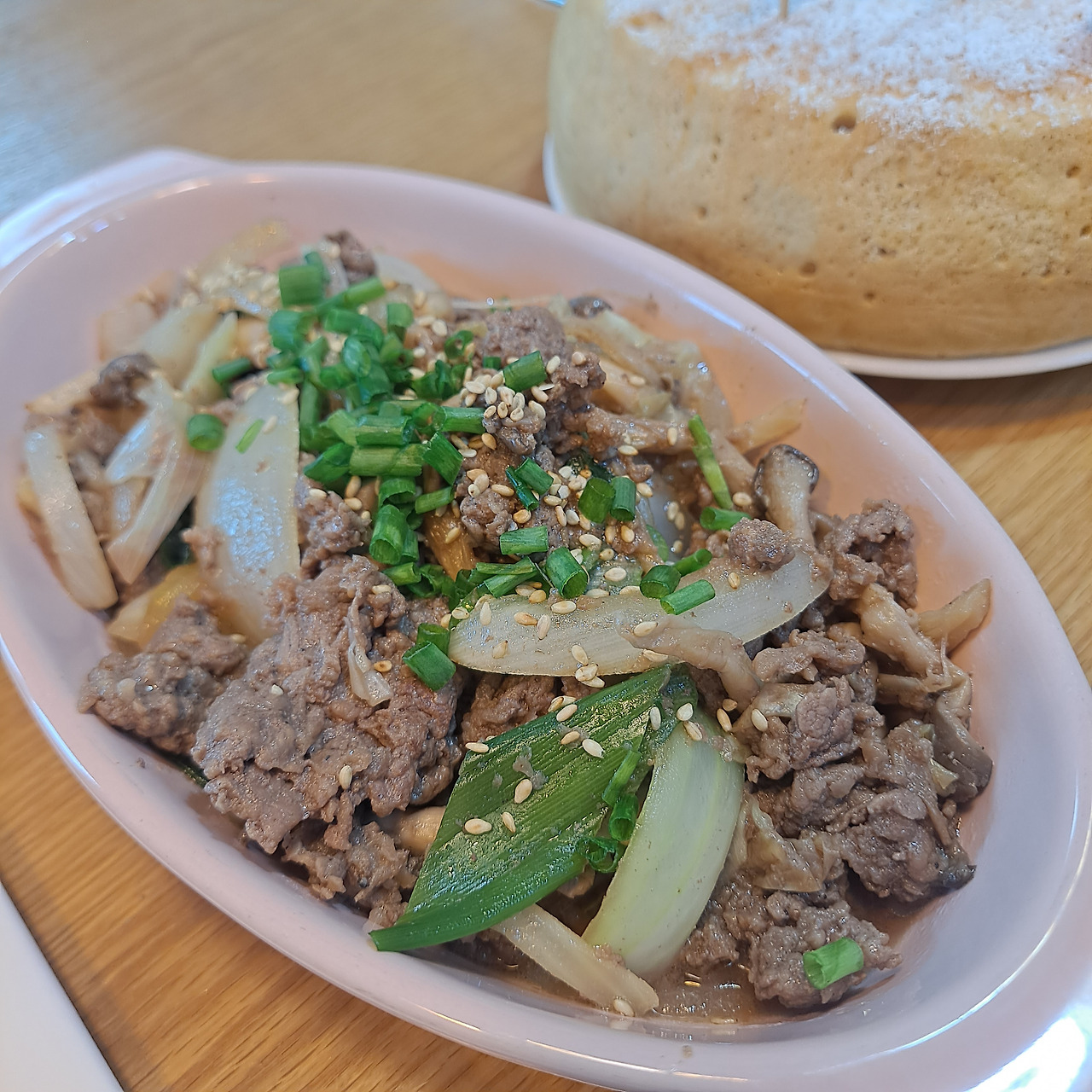 고기 러버인 남편을 위해 빠질 수 없는 메뉴, 한우불고기다. 양파, 버섯, 대파와 같은 미리 준비해둔 재료에 소고기를 양념해서 부지런히 볶아준다. 그릇에 담은 후 역시나 필살기는 바로 쪽파와 참깨로 마무리하는 것! 별거 아니지만 이게 있고 없고는 하늘과 땅 차이라는 점!