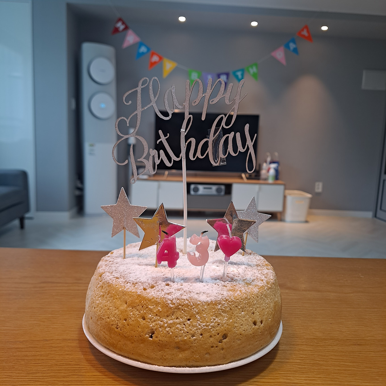 생일상에 빠질 수 없는 게 있으니 바로 케이크! 이 더위에 오븐을 가동할 엄두가 나지 않아 전기밥솥 찬스를 사용했다. 바로 밥솥 카스테라. 충분히 식혀준 후 슈가파우더를 솔솔 뿌렸다. 여기에 매번 등장하는 생일 픽까지. 이렇게 얼렁뚱땅 생일 케이크로 변신시켰다.