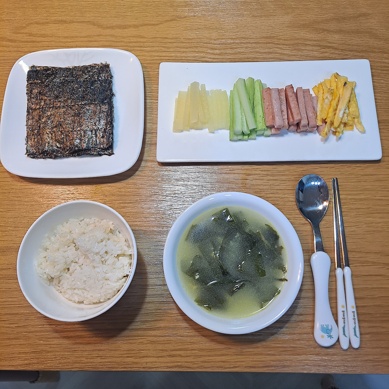 김밥 김은 4 등분해서 그릇에 담았다. 여기에 밥과 재료들을 얹어서 먹는 방식이라 덕분에 나는 노동력을 아꼈다고 좋아했으나, 결국은 아이들의 속도가 너무 느려서 보다 못해 김밥 싸는 걸 도와줬다. 곧 치킨 배달이 올 시간이라 마음이 급했다는 건 비밀.