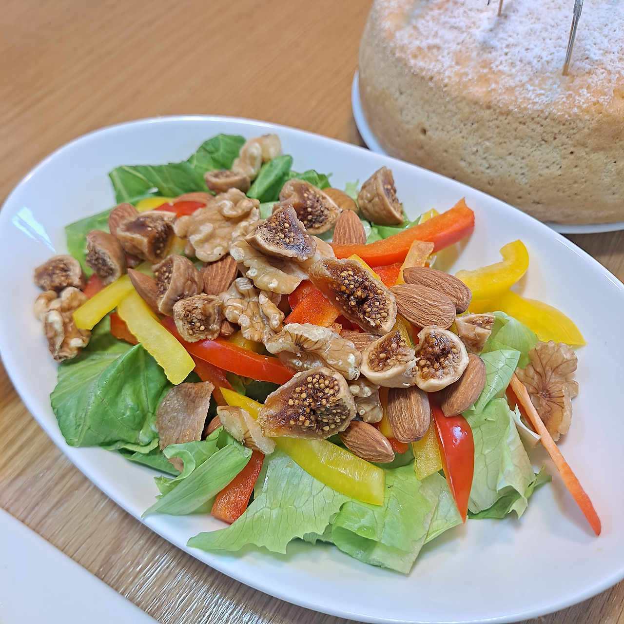 다음으로 샐러드. 샐러드야 말로 정답은 없다. 냉장고 상황에 따라 준비하면 되니 가장 마음의 부담이 없다. 단, 색감은 잘 살려주는 게 포인트. 냉장고를 살펴보니 청상추와 파프리카 남은 게 눈에 띈다. 여기에 견과류와 평소에 아끼던 반건조시킨 무화과를 썰어준다. 오늘은 생일이니까, 아낌없이 팍팍 넣어본다. 이렇게 무화과 샐러드도 완성이다.