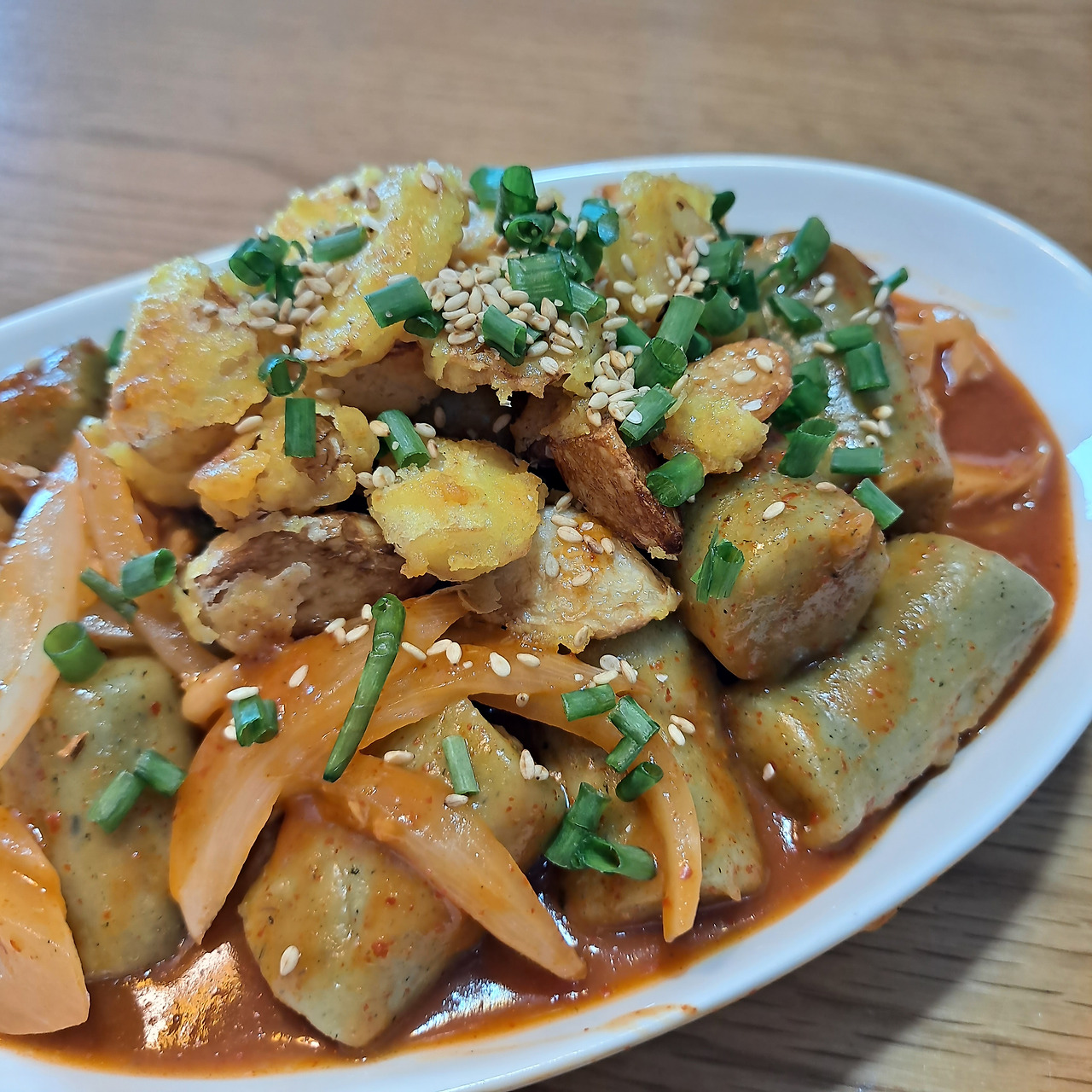 그리고 내가 사랑하는 떡볶이는! 역시 매콤해야 제맛이다. 마늘을 튀김가루 옷을 입혀주고 튀겨준 후 고명으로 얹어주면 또 색다른 맛이 된다. 알싸한 매력의 마늘은 역시나 떡볶이와 잘 어울린다. 냉동실에 있던 쑥 가래떡을 사용했더니 뭔가 우락부락 비장한 느낌이다.