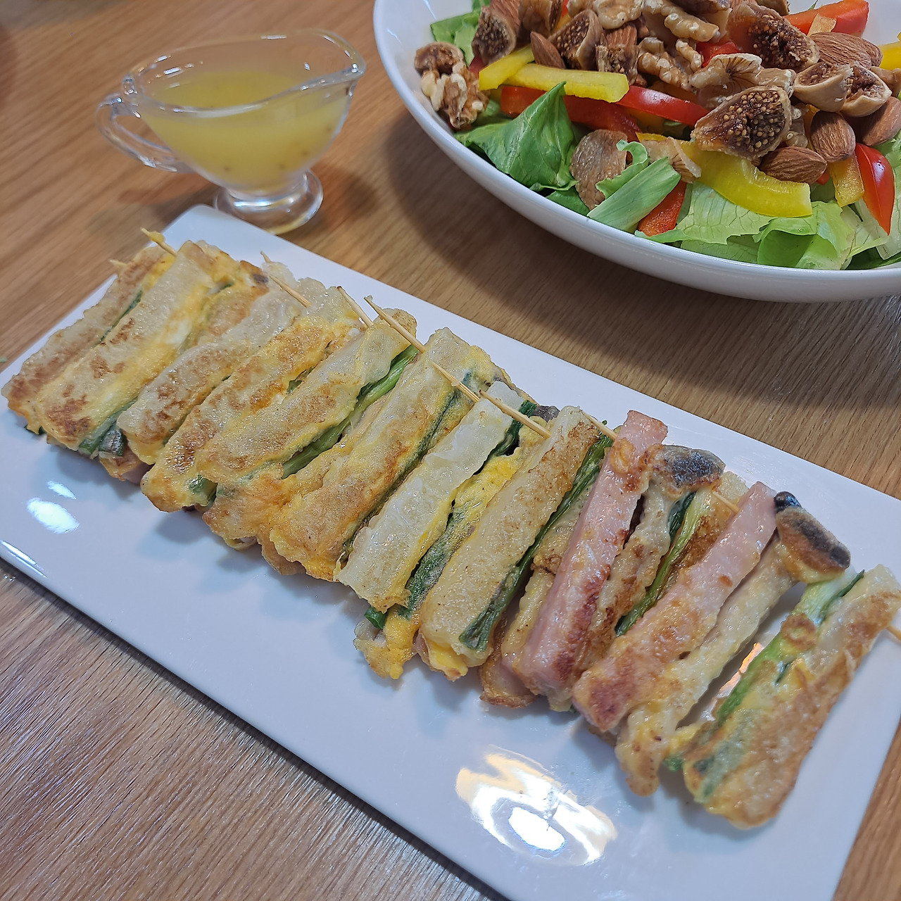 그리고 단무지와 쪽파 그리고 버섯, 이 네 가지 재료를 순서대로 끼운 후 밀가루와 계란물을 차례대로 입혀 구워주면 완성. (물론 나는 밀가루 대신 타피오카 전분을 사용) 처음에 한 두 개만 시범을 보여주면 나머지는 아이들의 몫이다. 소소한 주방 노동에 도움을 주는 녀석들! 놀이로 생각해주니 고맙구나.
