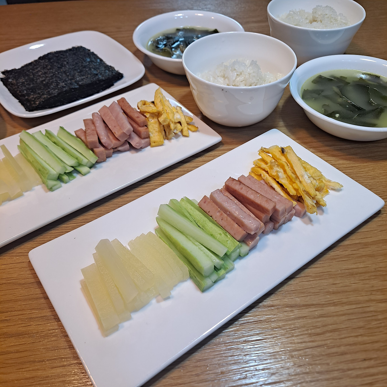 저녁 메뉴에는 산적을 만들고 남은 재료들이 대 활약을 했다. 바로 셀프 김밥 재료로 말이다. 단무지와 햄은 남은 자투리를 사용하고, 산적에 사용된 계란물 남은 것도 크게 부쳐서 잘게 썰었다. 여기에 오이만 하나 곁들였더니 김밥 재료로 손색없다. 남은 미역국까지 알뜰하게 먹어주면 이로써 오늘도 남김없이 먹기 미션 성공!