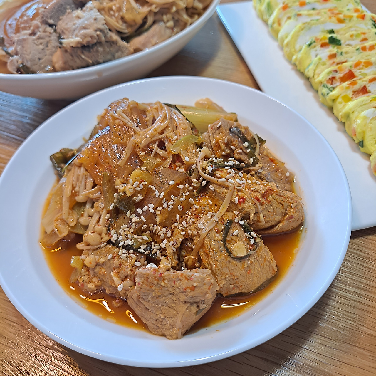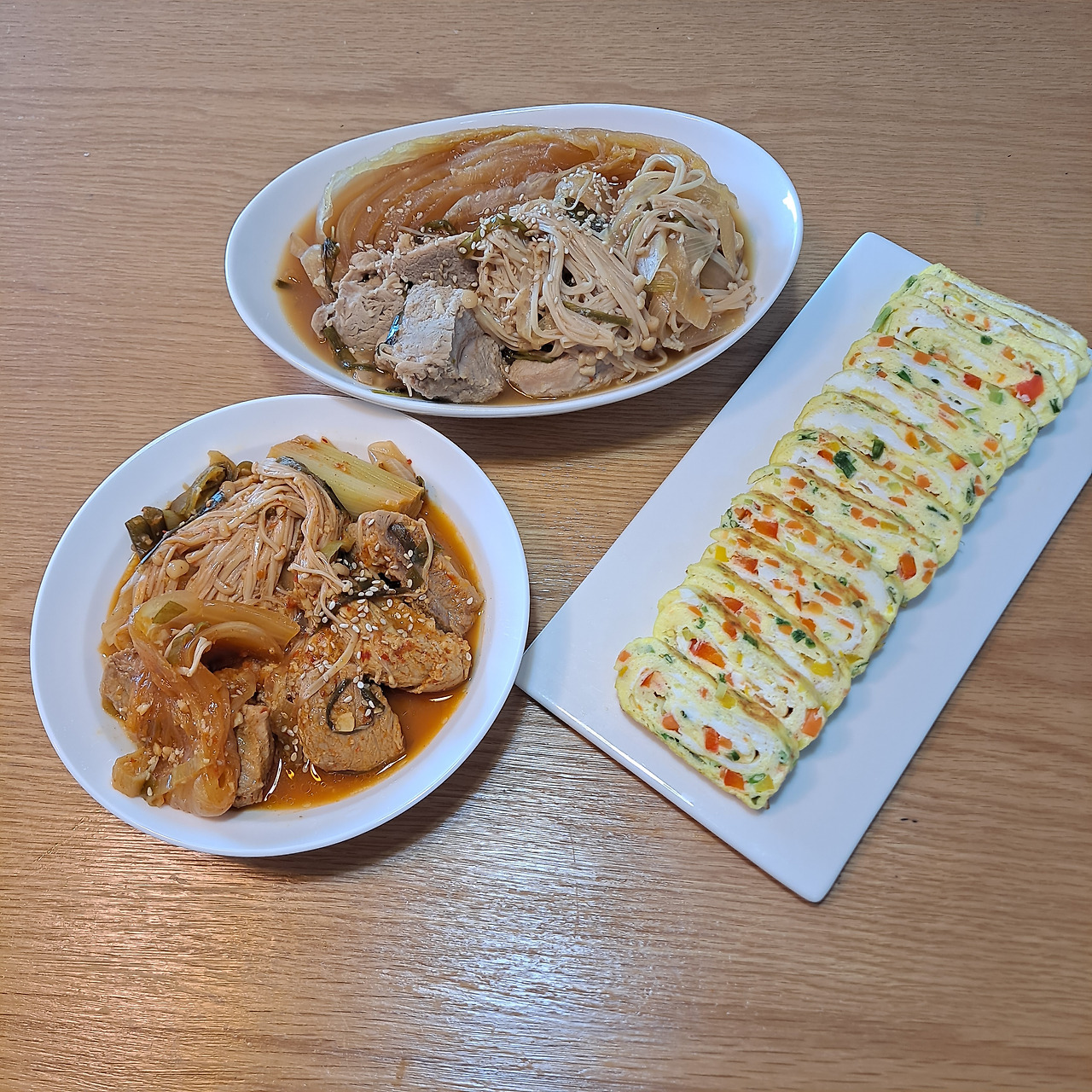 김치찜은 덜 매운 버전과 매콤한 버전 두 가지로 준비했다. 돼지고기 사태와 묵은지 그리고 다진 마늘, 양파, 파 이렇게 넣고 양념으로는 간장, 설탕, 미림을 넣어주고 푹 끓인다. 여기에 팽이버섯은 냉장고에 있길래 넣어 본 재료.