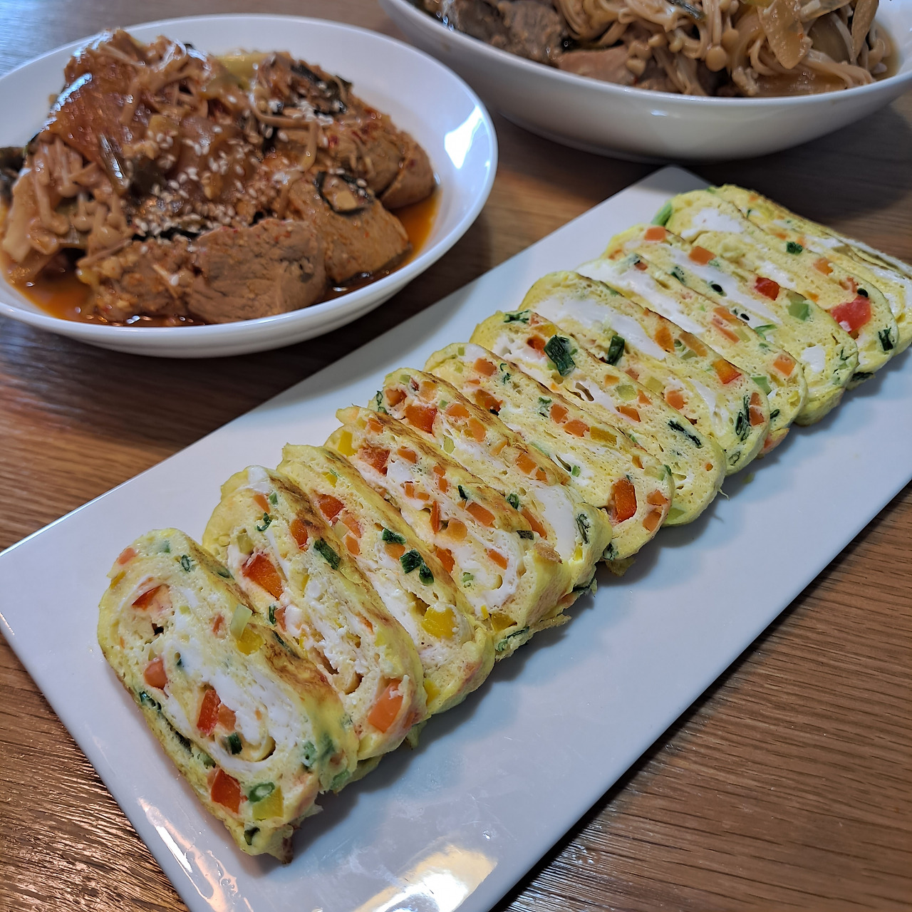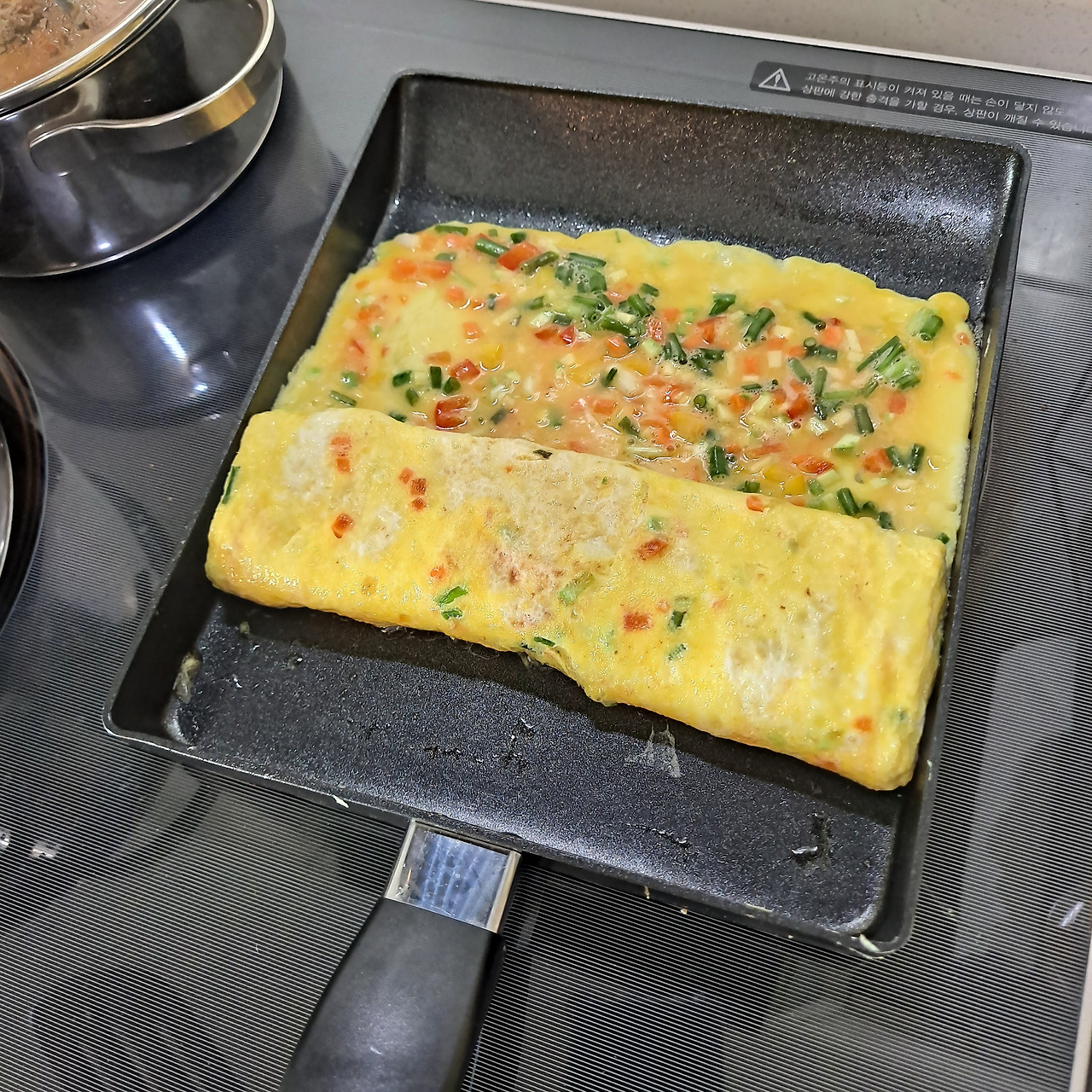 점심으로는 한식이 땡겼다. 물론 둘째의 김치찜을 해 달라는 요구사항도 반영할 겸. 김치찜과 찰떡으로 어울리는 반찬은 뭐 고민할 여지도 없이 계란말이이다. 각종 야채 썰어주어 넣어주고 돌돌 말아주면 끝. 예쁜 모양을 위해서는 네모 프라이팬이 필수이다. 샌드위치나 김밥에 넣을 계란을 부치기에도 제격이다.