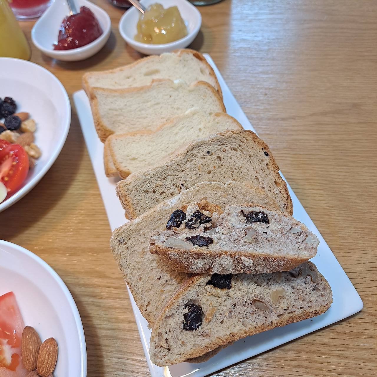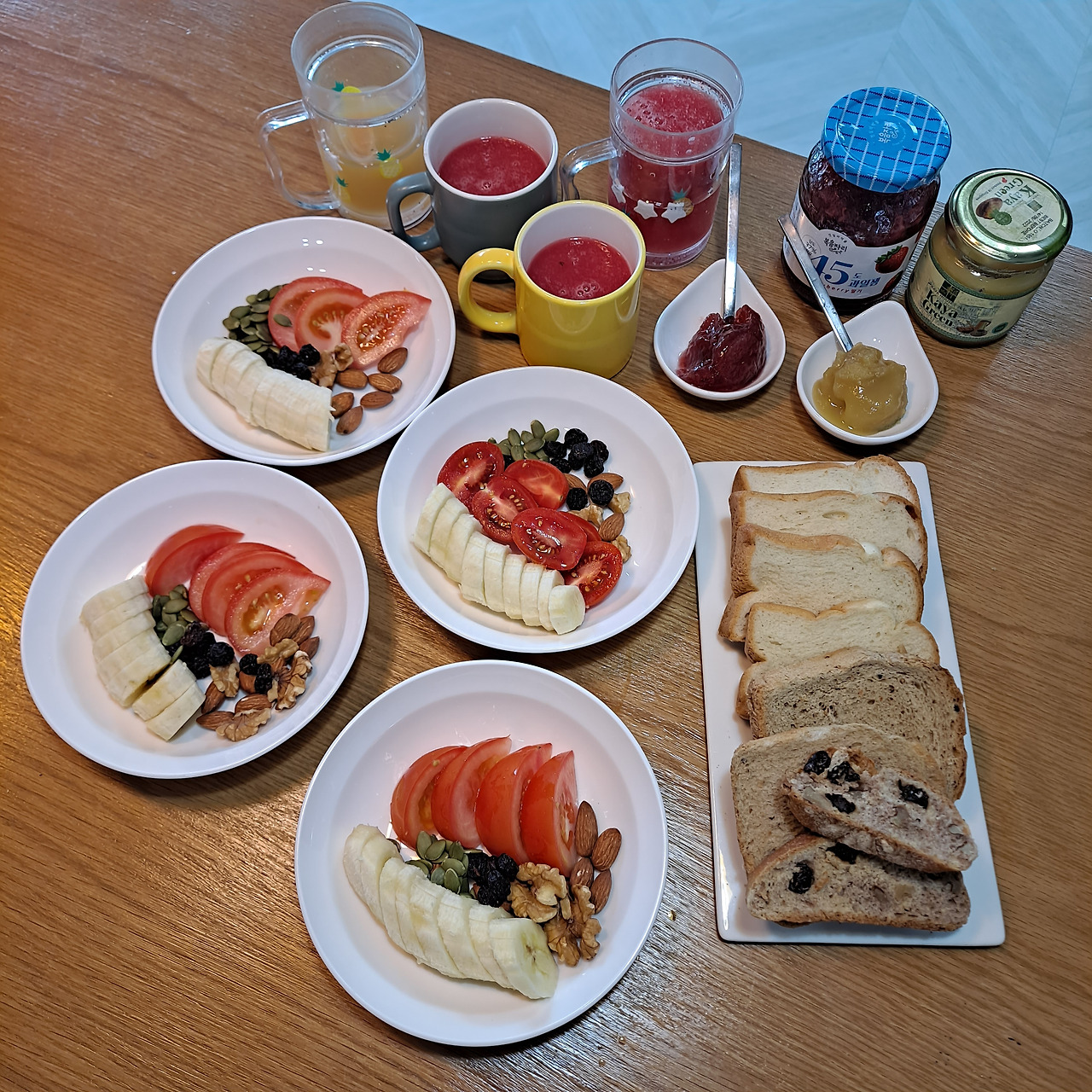 또다시 시작된 하루! 주일 아침도 어제 아침과 비슷하게 가볍게 먹는다. 어제 수박을 자르며 자투리 수박으로 만들어 놓은 수박주스와 냉동실에 남아있던 식빵들 총집합, 그리고 역시 바나나와 토마토, 견과류 등을 접시에 담아본다.