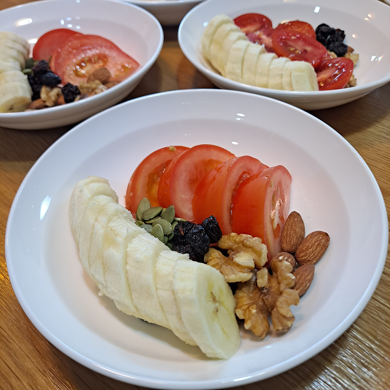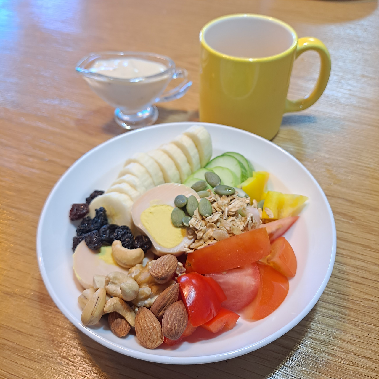 일단 토요일 아침밥상부터. 아침부터 힘 빼면 안 되니까, 무조건 가볍게 시작한다. 일명, 아무 건강 샐러드. 여름에는 역시 최대한 불을 쓰지 않는 요리가 최고다. 각종 야채와 견과류, 그리고 푹 익은 바나나에 단백질 담당 삶은 계란 까지. 사과주스까지 곁들이니 완전 건강식이 따로 없다.