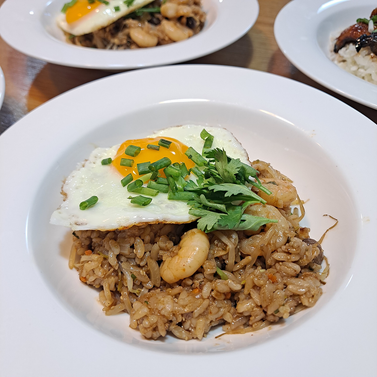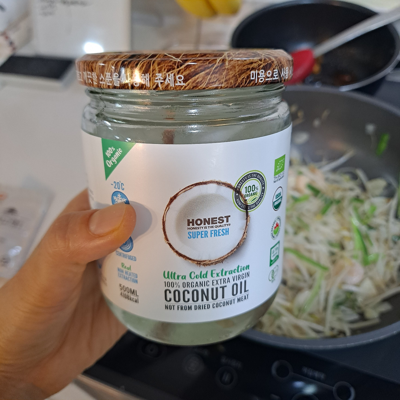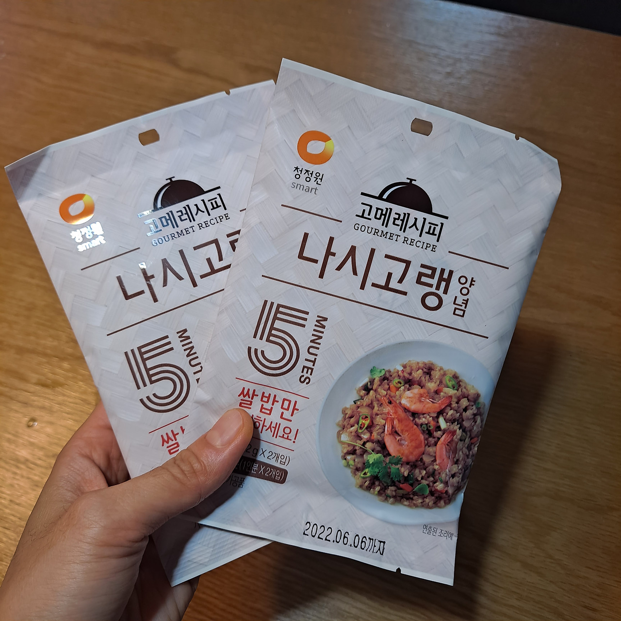 저녁 요리는 동남아 스타일로 결정! 나시고랭이 요새 종종 생각나던 터라 양념을 미리 사 두었다. 그리고 맛을 확 끌어올려 주는 코코넛 오일도 빠질 수 없다. 팬에 숙주나물, 새우, 마늘, 부추를 볶아주고 나시고랭 양념과 밥을 넣어준 후 잘 섞어준다. 마지막으로 계란 프라이 얹어주면 끝.