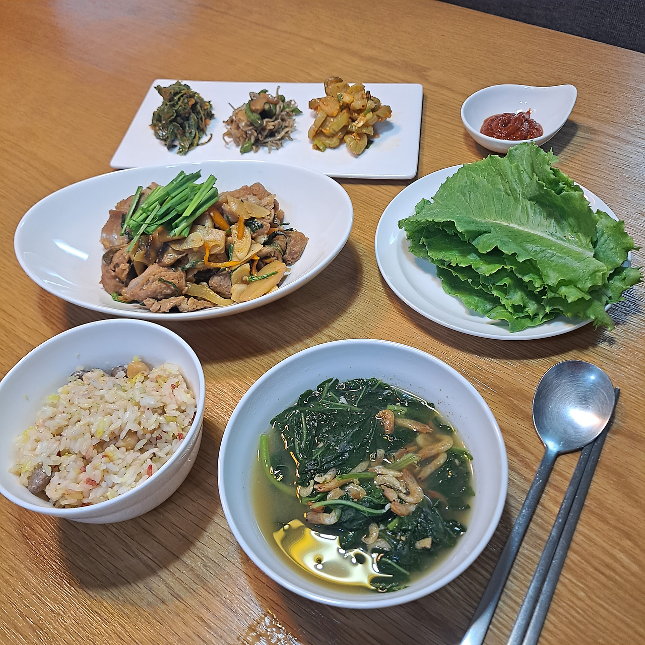 자고로 밥상에는 고기도 하나 있어야 하는 법! 양파, 파, 마늘, 부추도 넉넉히 곁들여 제육볶음도 서둘러 준비한다. 맛을 업그레이드시켜줄 상추쌈과 쌈장도 필수. 친정에서 주신 밑반찬도 꺼내 놓으니, 아! 이제 진짜 집밥 다운 집밥 완성이다. 보기만 해도 흐뭇한 비주얼이다.
