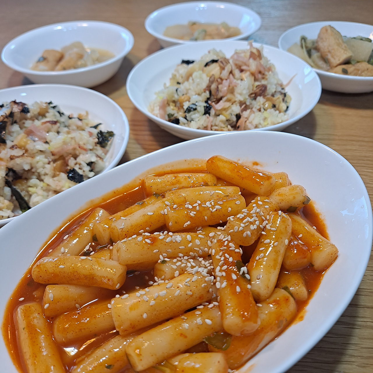 순대는 없냐고 아이들이 툴툴거릴까 봐 조마조마했는데 다행히 별말 안 한다. 휴 다행이다. 떡볶이는 어른 입맛에는 순한 매운맛인데 초등학교 저학년생인 아이들에게는 아직 매운가 보다. 짜식들. 그래도 포기하지 않고 도전하겠단다. 물에 헹궈서 먹기로 타협점을 찾고, 어묵탕과 김치볶음밥 그리고 떡볶이를 종횡무진한다. 빨리 커서 더 매운 떡볶이도 같이 먹는 날이 오길!