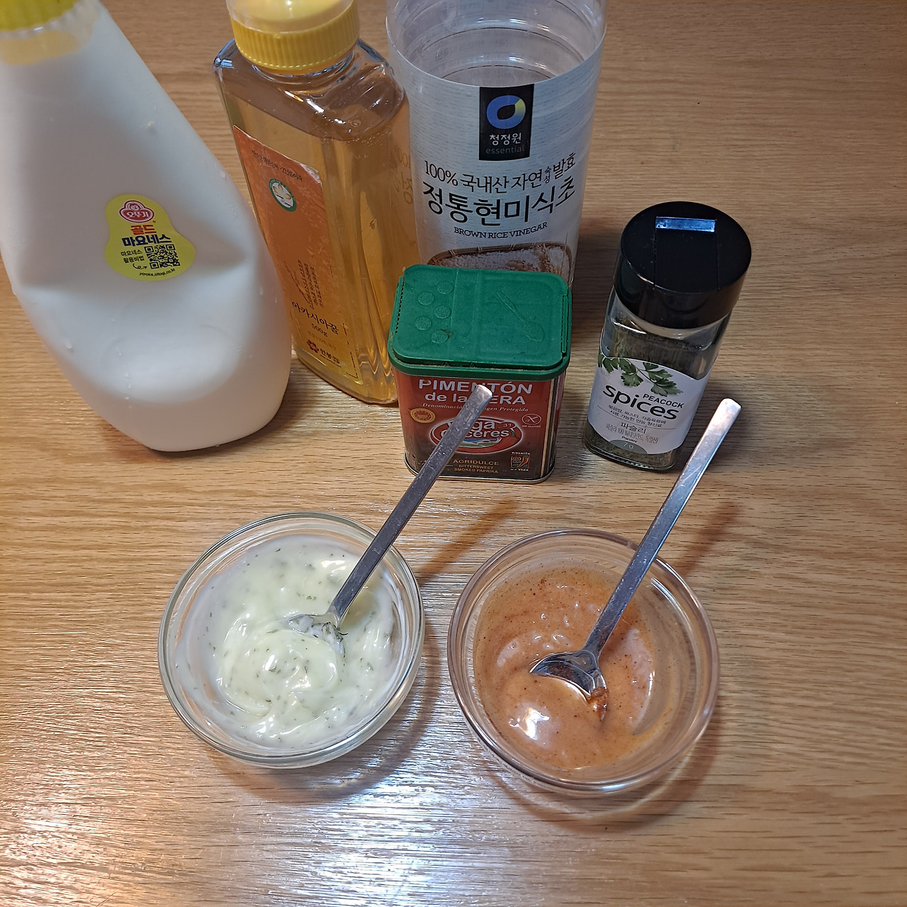 요거트나 연유가 있으면 금상첨화였겠지만 야매요리, 그것도 재료 상태는 확인도 안 하고 아무 대책 없이 단지 "먹고 싶다"는 본능에 충실하게 급 메뉴를 정한 탓에 머리를 쥐어짜 본다. 동시에 요리법도 폭풍 검색한다. 그러다 알게 된 마요네즈를 활용하는 방법! 다행히 파프리카 훈제 가루는 있어서 제법 그럴싸한 맛의 소스를 완성했다. 아, 시작이 좋다.