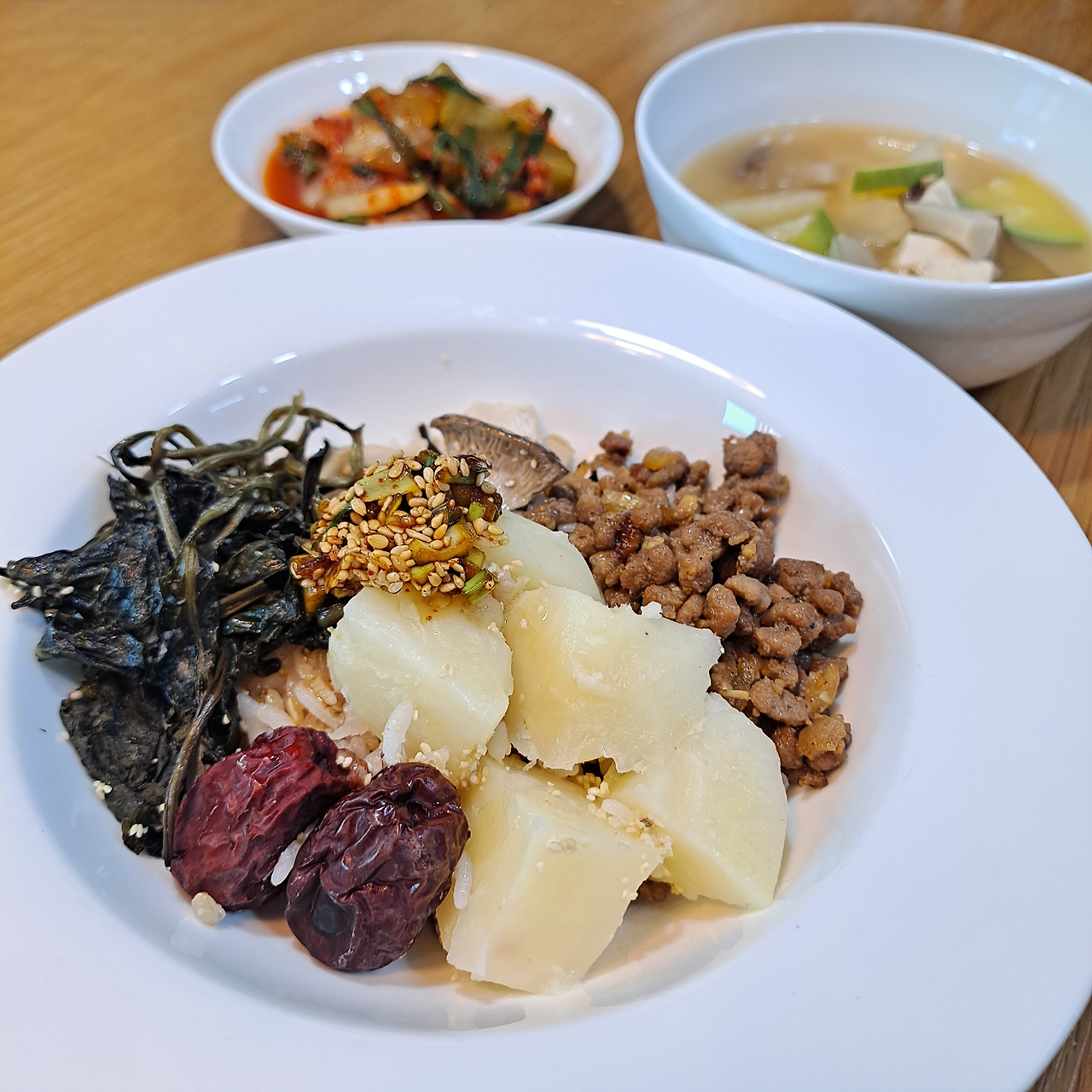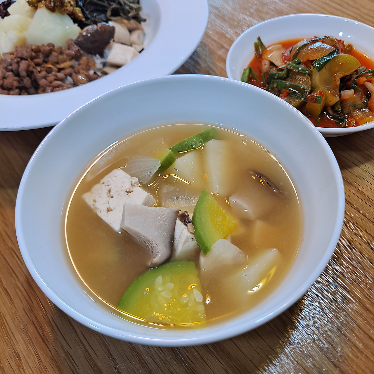 곤드레밥 하나만으로는 섭섭해서 된장국도 끓였다. 디포리와 다시마 등을 넣고 진하게 우려낸 육수에 된장을 풀고 야채들 때려 넣고 두부까지 더해주니 아, 세상 부러울 게 없는 맛이다. 비록 아이들 때문에 고추나 고춧가루는 넣지 못해 착하고 담백한 맛이지만 나이가 들수록 된장찌개가 세상에서 그 무엇보다 맛있다. 나도 모르게 "으아~ 시원하다"는 감탄사가 절로 나온다. 오이김치까지 곁들이니 여느 고급 한식 식당 부럽지 않다.