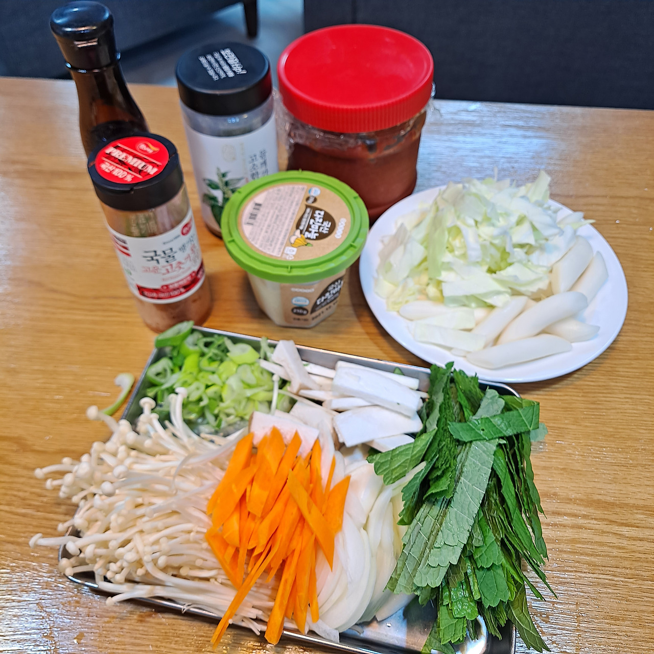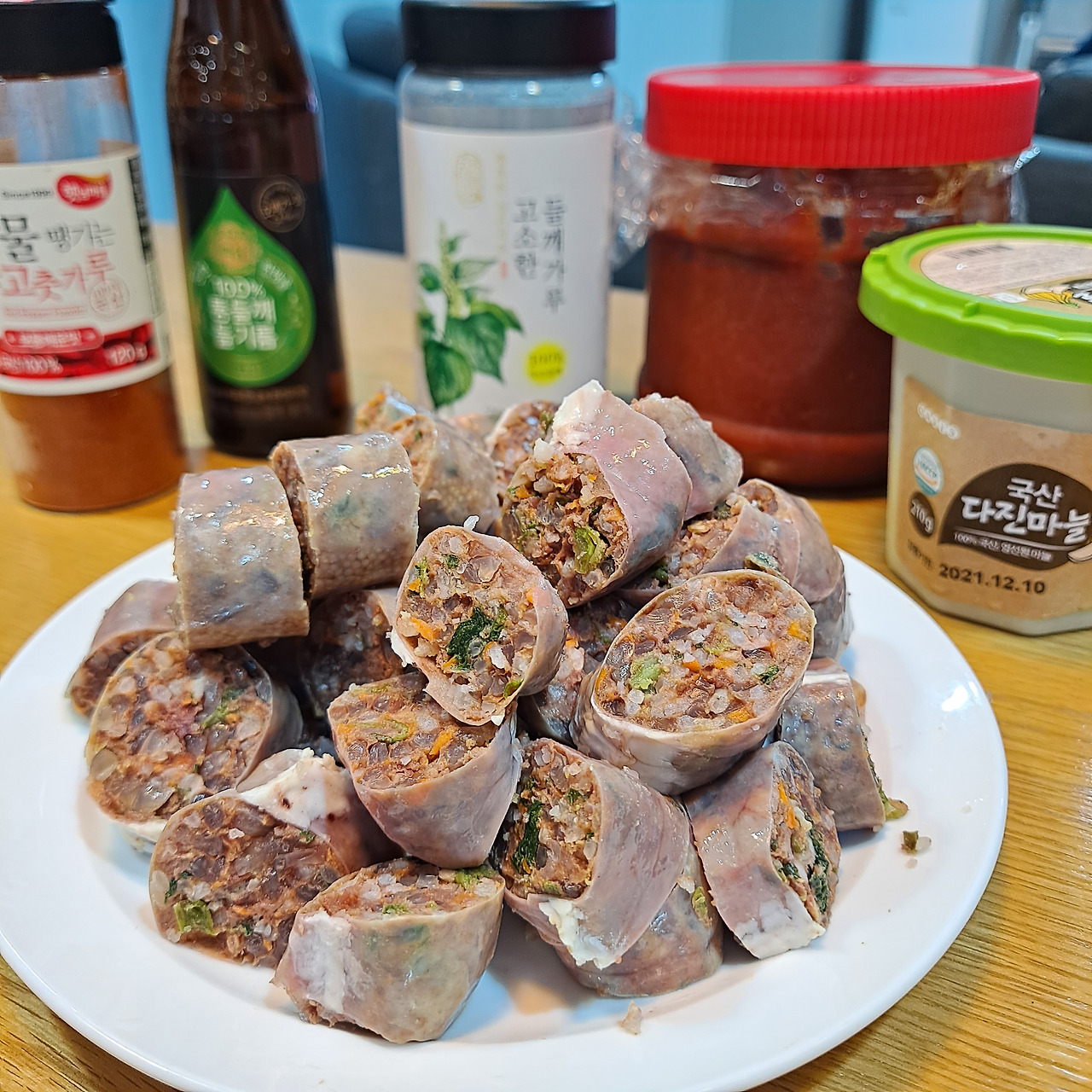 저녁 메뉴는 남편의 의견을 반영했다. 좀처럼 희망 메뉴를 잘 요청하지 않는데 순대볶음이 먹고 싶다며 며칠 전부터 이야기를 했다. 얼마나 먹고 싶었으면! 소원을 들어주기 위해 온라인몰에서 순대와 깻잎을 사놨다. 여기에 집에 있던 재료를 뒤져보니 떡볶이 떡, 양배추, 양파, 버섯 등이 있어 모두 식탁 위로 소환시킨다. 그리고 순대볶음의 핵심 재료는 단연 들깨가루와 들기름이다. 그리고 오늘의 주인공, 귀하신 몸 순대까지 등장하고 나면 이제 재료 준비는 끝!