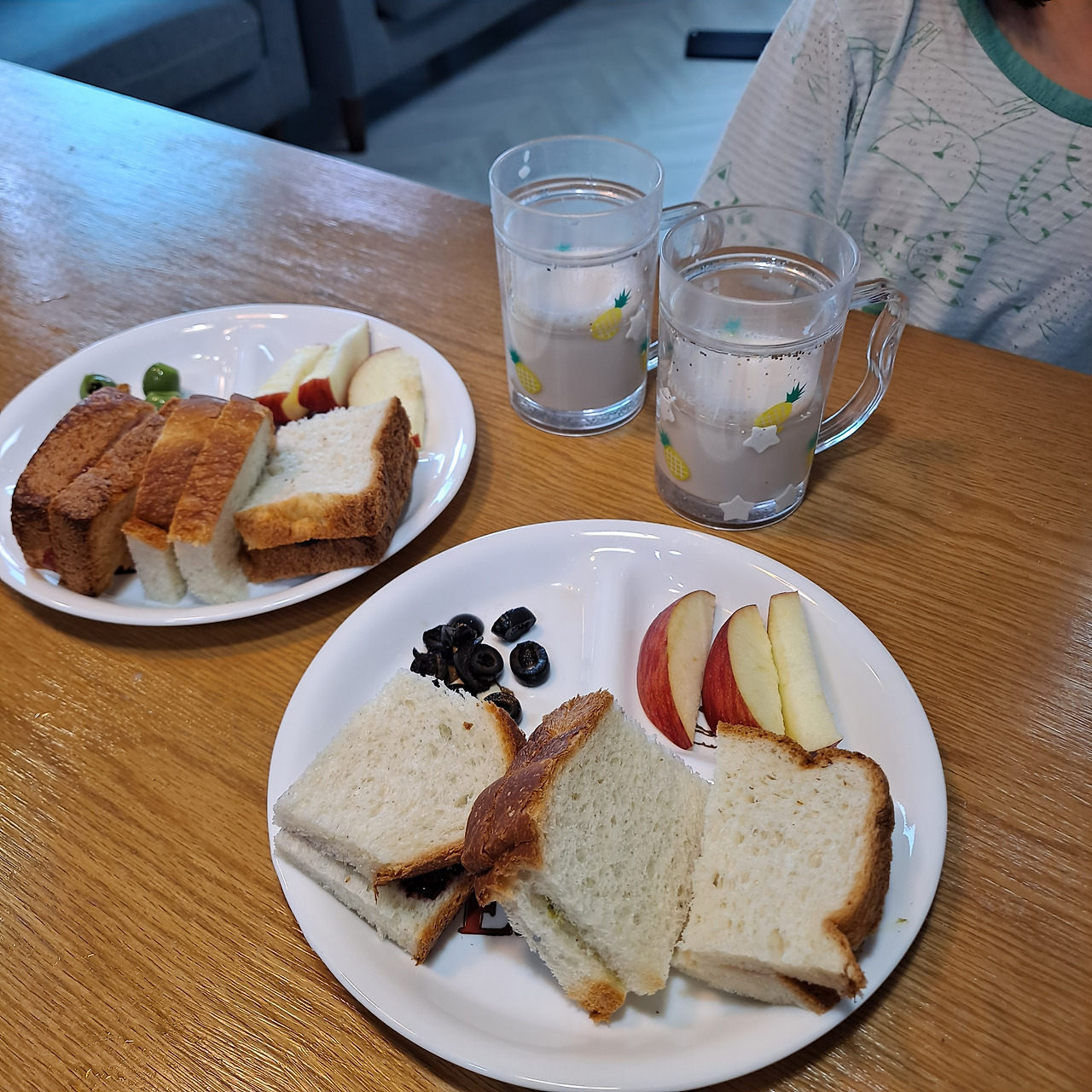 내복쟁이들의 아침. 삼색잼과 사과, 올리브절임, 아몬드유로 간단하게
