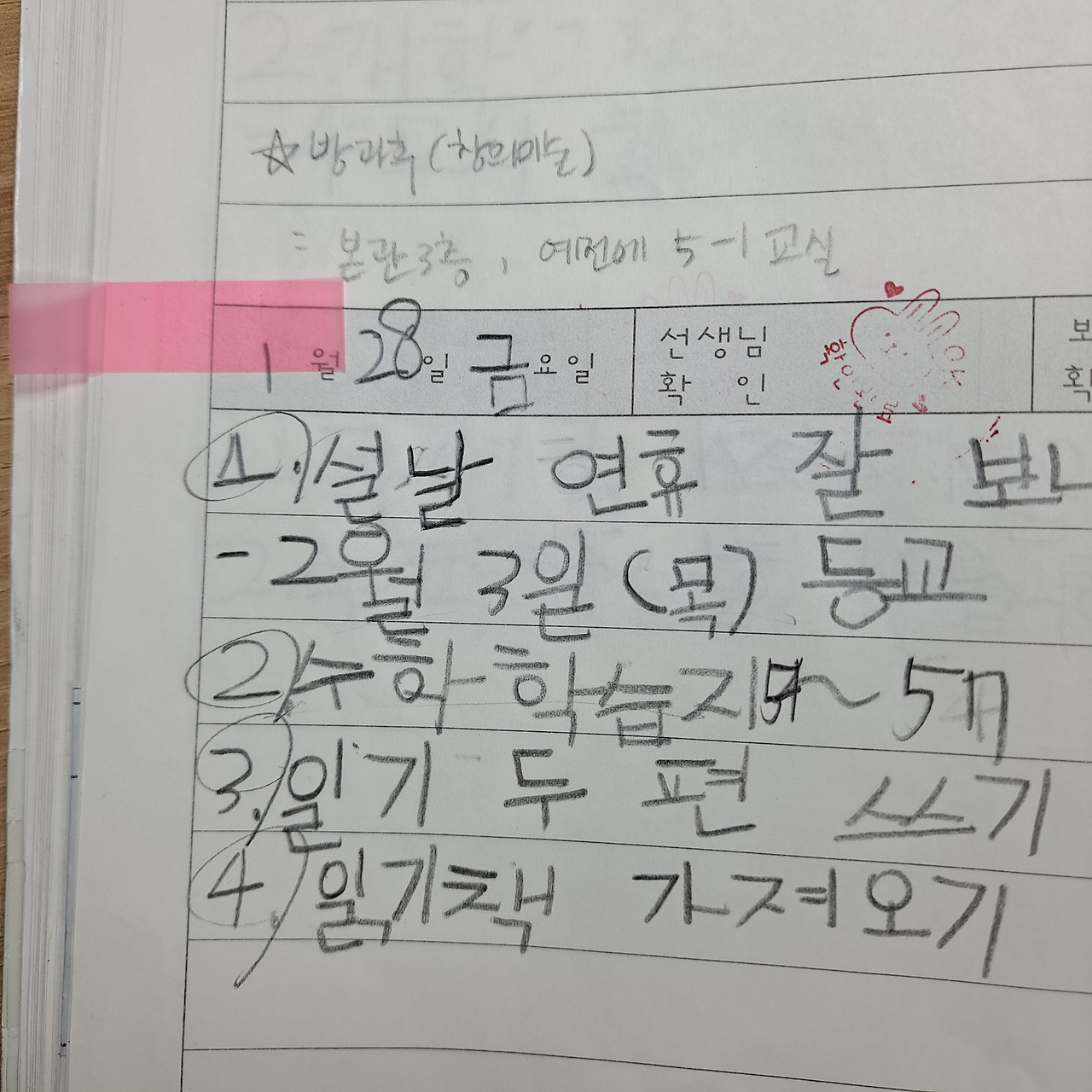 마지막으로 알림장을 잘 활용하는 것입니다. 선생님과 아이 사이에만 알림장이 필요한 것은 아닙니다. 부모와 아이 사이에도 추가적으로 챙겨야 할 내용도 종종 있거든요. 따로 알림장을 구비하보다 기존의 알림장의 한 귀퉁이를 활용하면 됩니다. 알림장은 부모와 아이가 매일 확인하기 때문이지요. 빈 공간에 필요한 내용을 추가적으로 기입하면 좋습니다. 아이가 부모에게 알려야 할 내용을 적기도 하고(예: 풀 다 사용, 새로 풀 챙기기), 부모가 아이에게 공지할 내용(예: 방과 후 창의 미술, 본관 3층으로 변경)을 적어 서로 소통하는 것도 좋은 습관입니다.