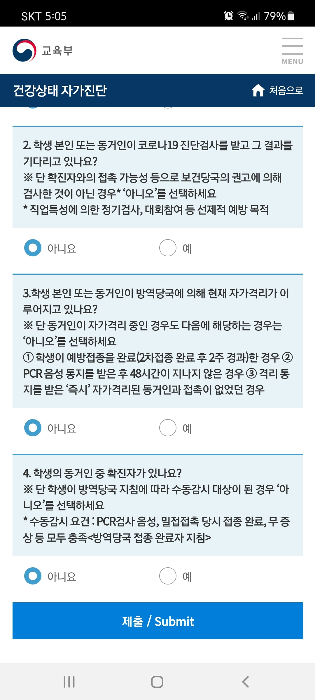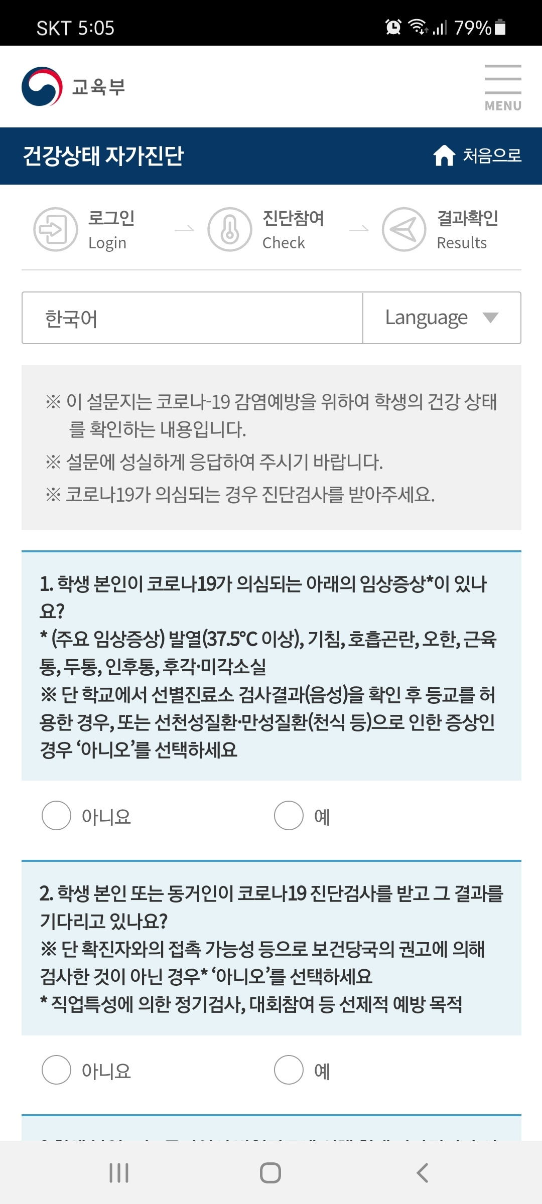 교육부에서 배포하는 앱인 '건강상태 자가진단'을 다운로드한 후 매일 가정에서 자가진단 체크를 해야 합니다. 반드시 등교 전 오전에 자녀의 건강상태를 체크해야 하며 하나라도 해당되는 항목이 있을 경우 등교가 불가합니다. 이럴 경우 해당 화면을 캡처하여 담임선생님과 보건실 선생님께 전송해야 하며 코로나 검사 후 결과 또한 동일한 방법으로 전달해야 합니다.