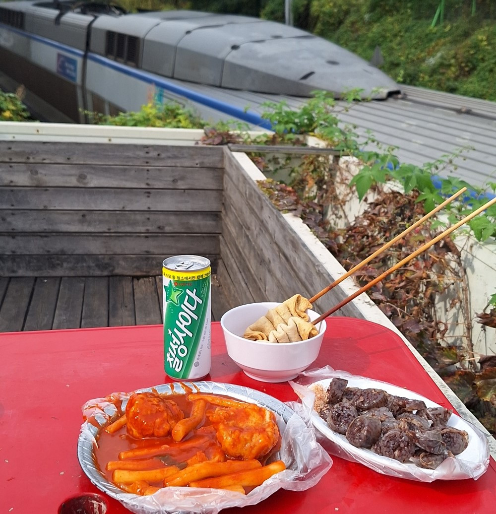 기다림 끝에 드디어 우리 차례가 되어 메뉴가 나왔다. 떡볶이, 못난이, 어묵, 순대, 탄산음료로 한 상이 차려졌다. 때 마침 고맙게도 기차가 지나가주었다. 이를 놓칠세라 열심히 사진과 동영상을 재빨리 남긴 후 대망의 시식에 들어갔다. 사실 뷰가 다 했기에, 맛이 별로여도 문제가 되지 않았을 것 같다.