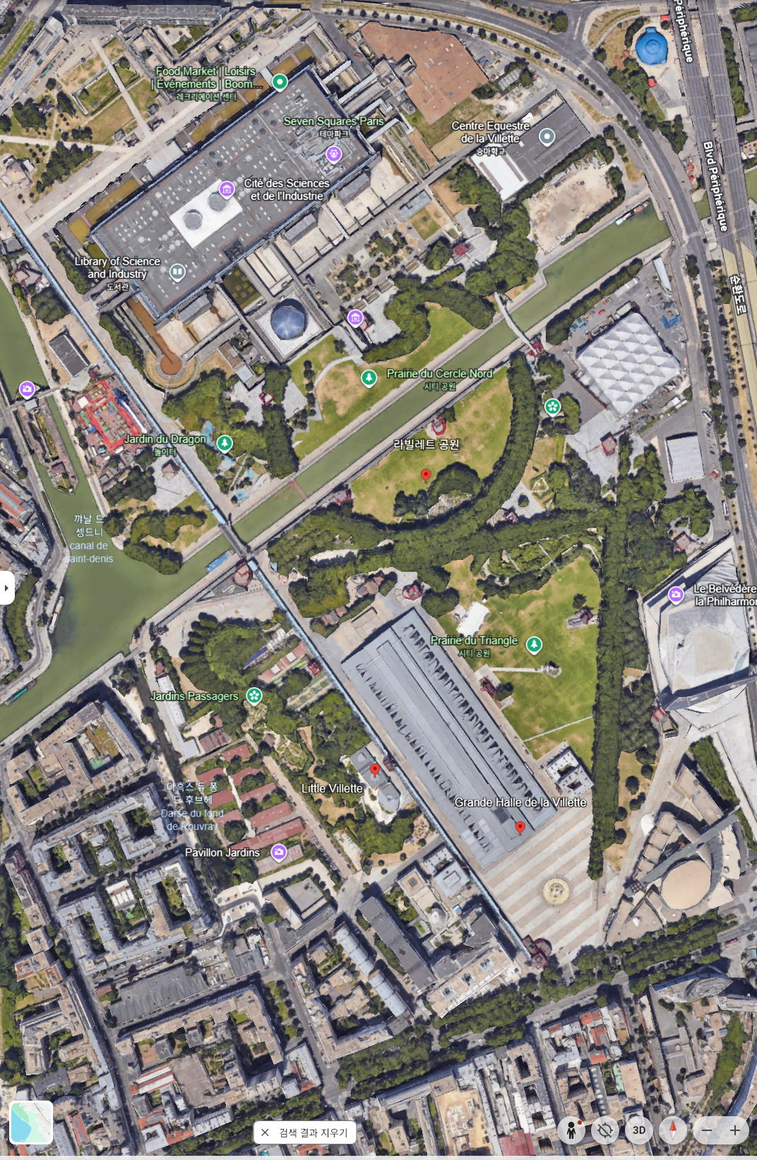 지도에 펼쳐진 이곳은 단순한 공원이 아니다. 음악의 도시-파리 필하모닉(Cité de la musique - Philharmonie de Paris)과 과학 산업 박물관(Cité des sciences et de l'industrie)이라는 두 축을 중심으로, 국립 고등 음악 무용원(Conservatoire national supérieur de musique et de danse de Paris), 공연장인 제니스 파리(Le Zénith Paris), 카바레 소바주(Cabaret Sauvage), 파리 빌레트 극장(Théâtre Paris-Villette) 등 춤, 연극, 서커스, 음악, 과학 기술 문화가 한데 어우러진 거대한 '문화 예술 생태계'이다.