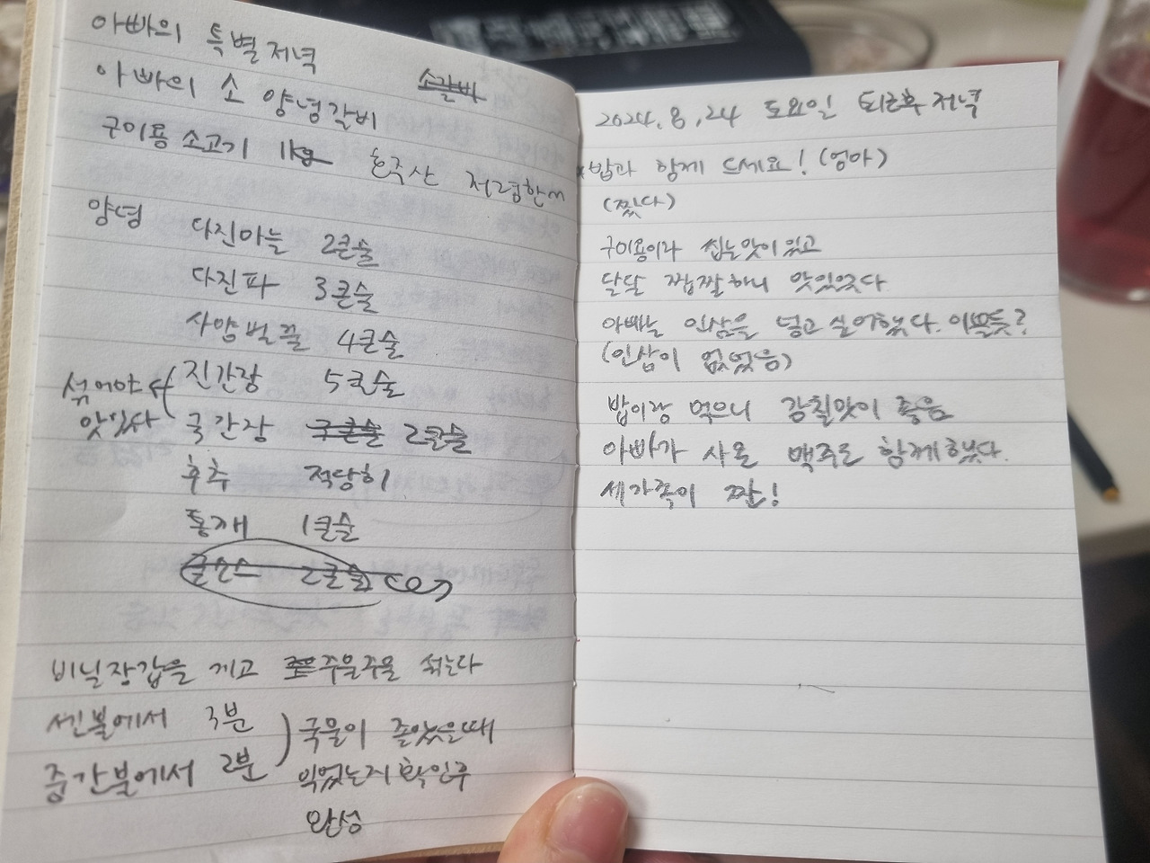 아빠의 레시피는 엄마의 레시피와는 달라서 또 다른 맛을 냅니다. 엄마의 레시피는 자극적이지 않은 담백한 맛이 일품이라면, 아빠의 레시피는 종종 화끈하고 강렬한 맛을 내곤 합니다. 몇 장 쓰지 않고 책상 위에 올려뒀던 작은 수첩을 엄마와 아빠의 레시피 북으로 쓰기로 했습니다. 고기가 익기를 기다리며 아빠를 인터뷰했습니다.