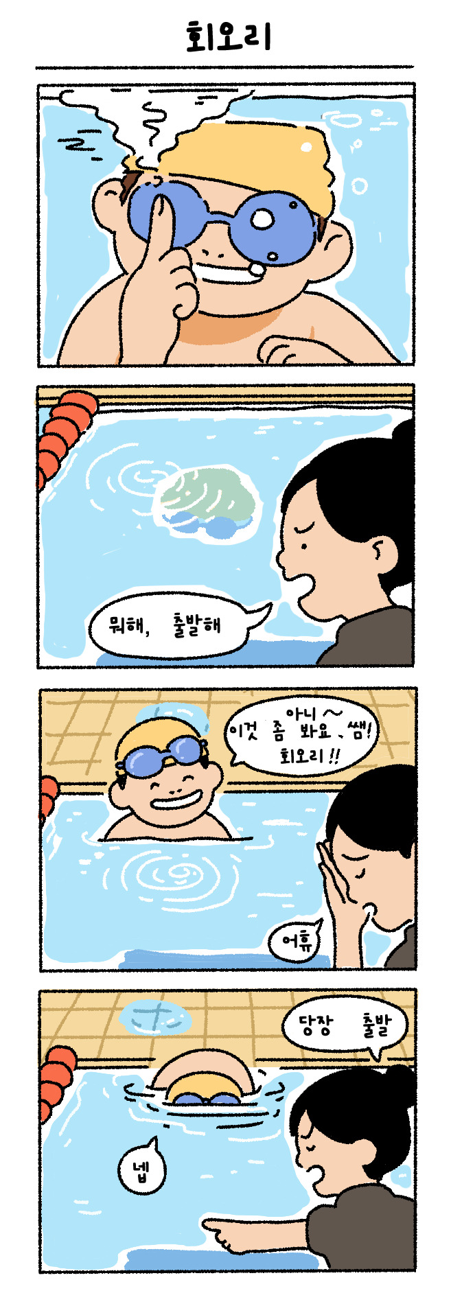 나는 크게 두 개의 직업을 가지고 있다. 하나는 그림을 그리는 일러스트레이터, 다른 하나는 수영 강사이다. 20대의 대부분의 날들을 수영장과 함께 지나오고 있는 중이다. 20살의 여름, 자격증을 따고 일을 하기 위해 수영장에 출근했다. 아주 어렸을 적부터 수영 선수로 훈련해 오다가 중학교 2학년 겨울 선수를 그만두게 되었다. 그 시절에는 다시 수영장에 돌아가면 성을 간다고 하며 그만뒀던 수영이었는데. 삶이 생각처럼 흘러가지 않는다고 하던가. 나는 예술대학에 입학을 하고서도 수영장에 돌아오게 됐다. 20살, 회원들보다도 어린 수영강사가 되어 일을 시작했다. 처음 강습날에는 너무나 긴장되고 떨려 1층 약국에서 청심환을 몰래 사 먹고 강습에 들어갔다. 반년 전까지 고등학생이었는데, 내가 어떻게 성인들 강습을 하지? 어린아이들 수업도 마찬가지였다. 다른 교과 강사들은 수업 준비기간, 실습시간이라도 갖는데, 수영강사는 일단 들어가서 몸으로 부딪혀야 했다.