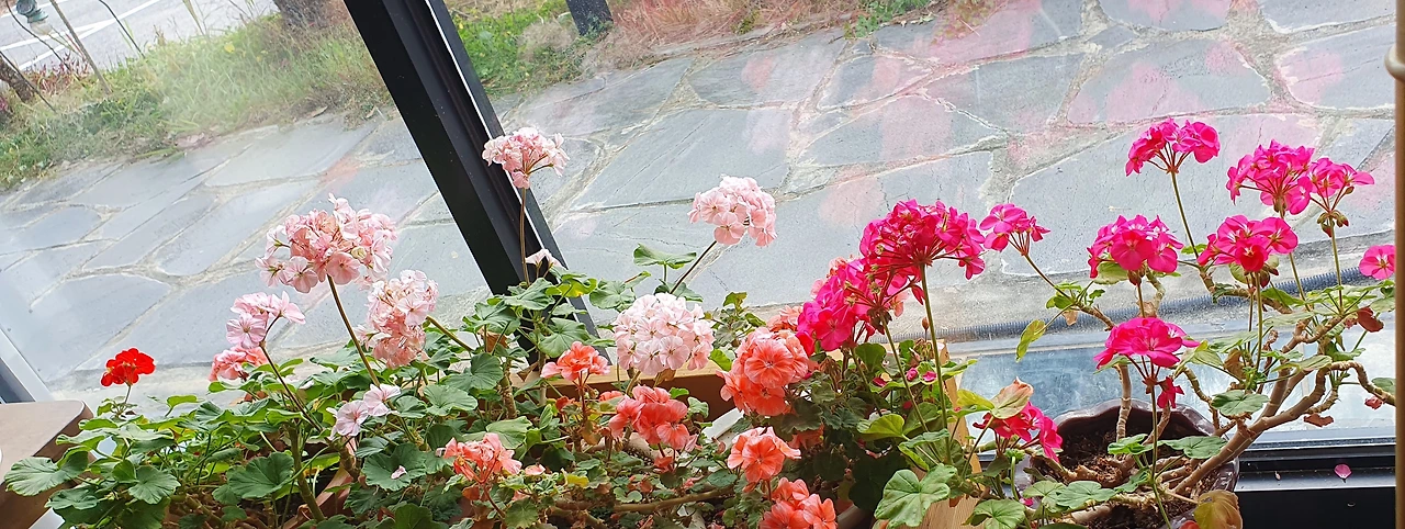 실내의 제라늄 붉은, 분홍 빛 꽃들