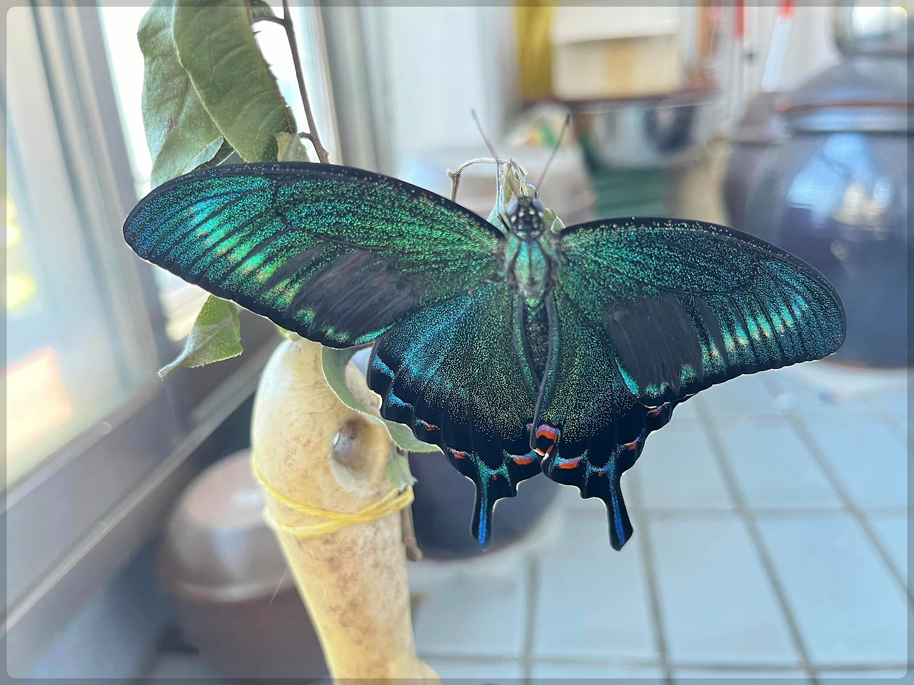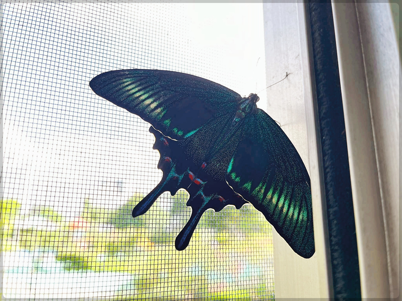 계속 지켜보고 싶었지만 출근을 해야 해서 아쉬워하면서 나비만 남겨놓고 집을 나갔다. 저녁에 최근해서 돌아오자마자 베란다로 갔다. 나비는 창문 방충말에 붙어있었다. 정말 아름다운 모습이었다. 그 작은 번데기에서 이렇게 커다란 나비가 나오다니 신기했다.