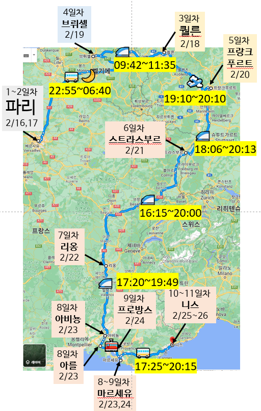 나의 관심사는 프랑스였고, 친구는 교환학생 시절 친했던 유럽 친구들을 만나고 싶어했다. 그래서 12일간 프랑스, 독일, 벨기에를 찍고 오자는 원대한 계획이 완성되었다. 총 경비에서 교통비만 거의 절반이 들었다. 숙박은 대부분 기차역과 가까운 곳으로 구했다. 항공편은 갈 때는 암스테르담에서 경유 1회를 하고 올 때는 경유를 하지 않았으나 13시간을 비행기 안에서 버텨야했다. 경유가 짧거나 없는 가장 저렴한 에어프랑스를 왕복 비행기편으로 구매하였고, 짐은 12kg 이내 기내 수화물만 이용했다. 12일 여정에 달랑 기내용 캐리어만 끌고 다니는 것은 조금 무모한 도전이기도 했다. 그래도 겨울이어서 옷이 많이 필요하지 않았고, 한국으로 돌아오는 비행기에 수화물을 추가해서 소중한 기념품은 캐리어에, 입던 옷처럼 다소 안 중요한 물품은 다이소 타포린백에 담아서 야무지게 다녀왔다.