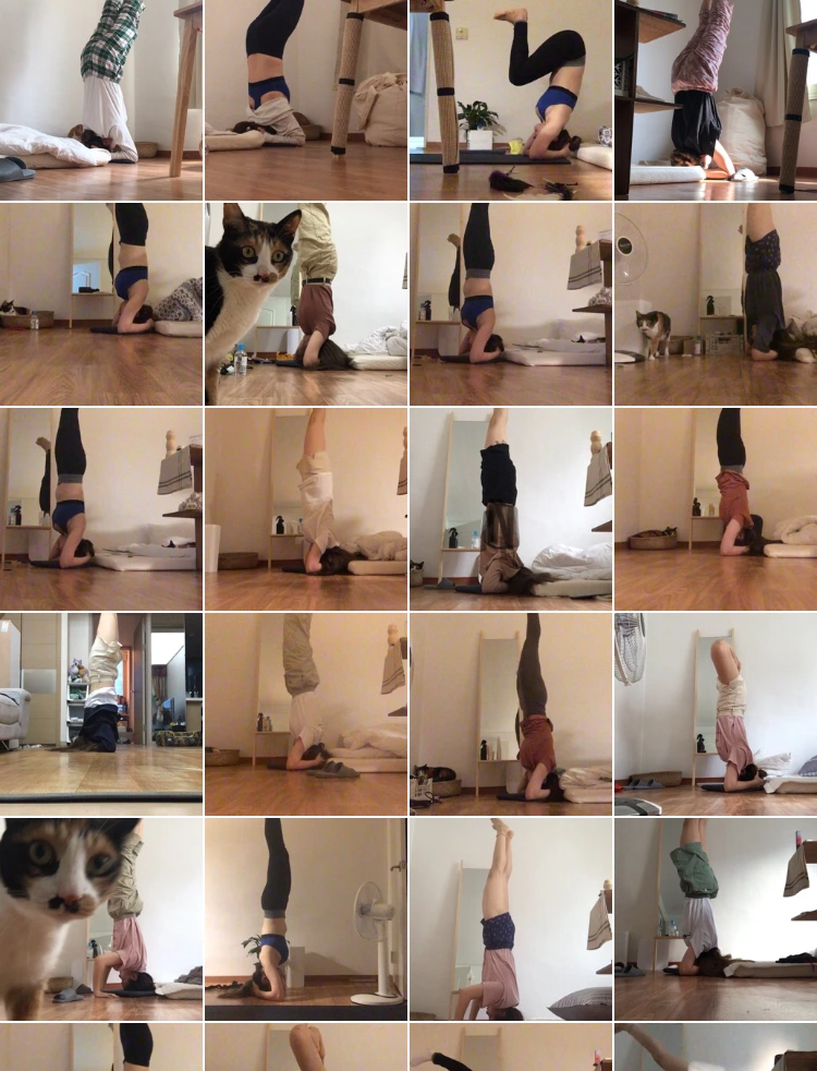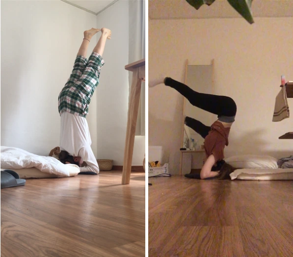 사실 이는 앞서 말한 것과 같이 산만한 동작은 결코 아닌데, 집에서 언제든 할 수 있고 본인 기준에서는 그 외 -위험하고 독특하고 신나는-에 부합했기 때문에 3주 차 때부터 실천하기 시작했다. 요가의 꽃이라고 불리는 시르사아사나(sirshasana)라는 동작으로 원래는 집중력과 심신의 안정과 같은 말들이 딸려오는 자세이나, 고백하건대 나는 순전히 재미의 일환으로 시작했다..