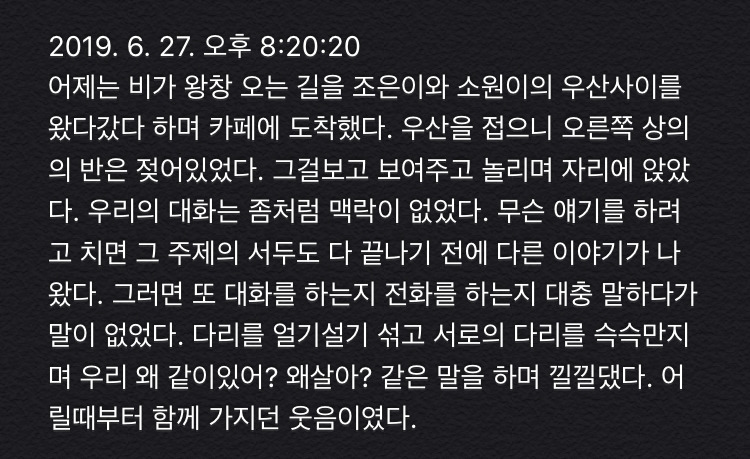 마음의 옆자리와는 관계없이 부산에서 서울에서 각자의 삶을 사는 동안 서로의 디테일에 대해 점차 아는 게 없어졌다. 종일 붙어 앉아 일상과 남자와 가족과 사건에 대해 떠들던 때와는 달랐다. 물리적 거리는 생각보다 컸고, 어른의 무게는 생각보다 바쁘고 무거웠기 때문이다. 이제는 드문 한 연락 속에서 어떤 디테일에 대해 생략하고 침묵한다. 사건의 한 복판이 아닌 잘 정리된 지난 일을 공유하고 지금 겪고 있는 일에 크게 호들갑 떨지 않고 응원한다.
