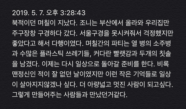 미쳐 다 읽지 못한 내용에 진득하고 진심 어린 그의 마음이 담겨 있었다. 엊그제 많이 운 게 괜스레 민망해 애써 시큰해지는 코를 부여잡았다. 그 앞에서는 유독 정신 나간 사람처럼 신나게 웃고 갓 태어난 아이처럼 서럽게 울었다.
