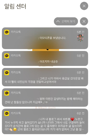 너 블로그 봤는데 글 잘 쓰더라. 근데 왜 거기 나 없어! 하는 내용에 이모티콘이 잔뜩 붙은 문자.