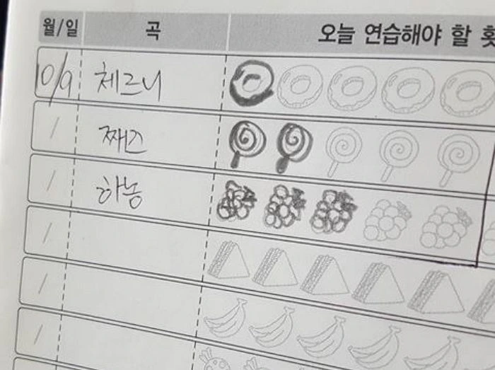 아마 피아노 학원을 다니셨다면, 학원에서 나눠주는 연습장을 기억하실 거예요. 동그라미가 그려진 연습장에 한번 피아노를 칠 때마다 체크를 하며 연습량을 채웠습니다. 그래서인지 피아노 학원에서 보냈던 시간을 생각하면, 작은방에 들어가 홀로 연습을 했던 기억이 대부분을 차지합니다.
