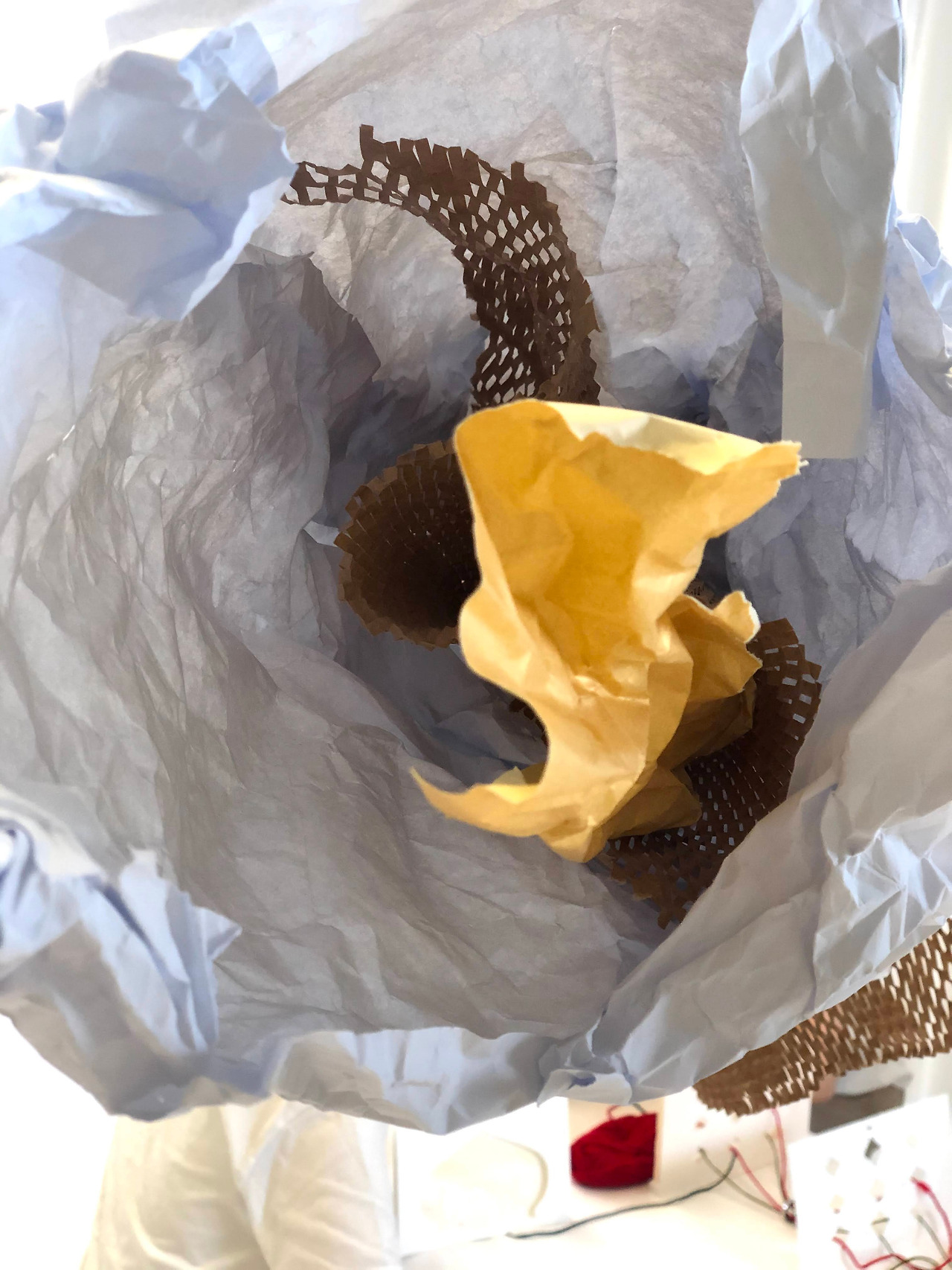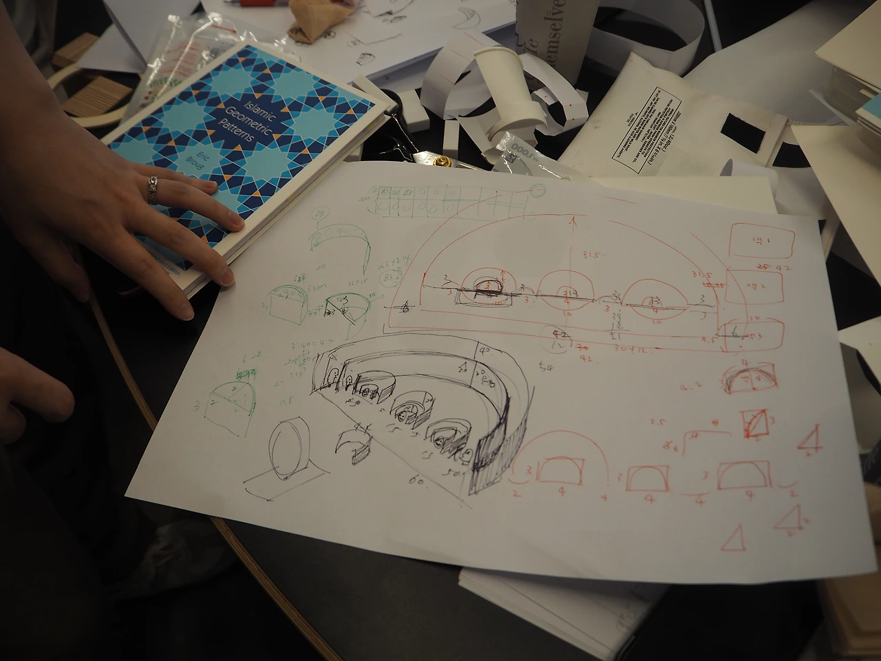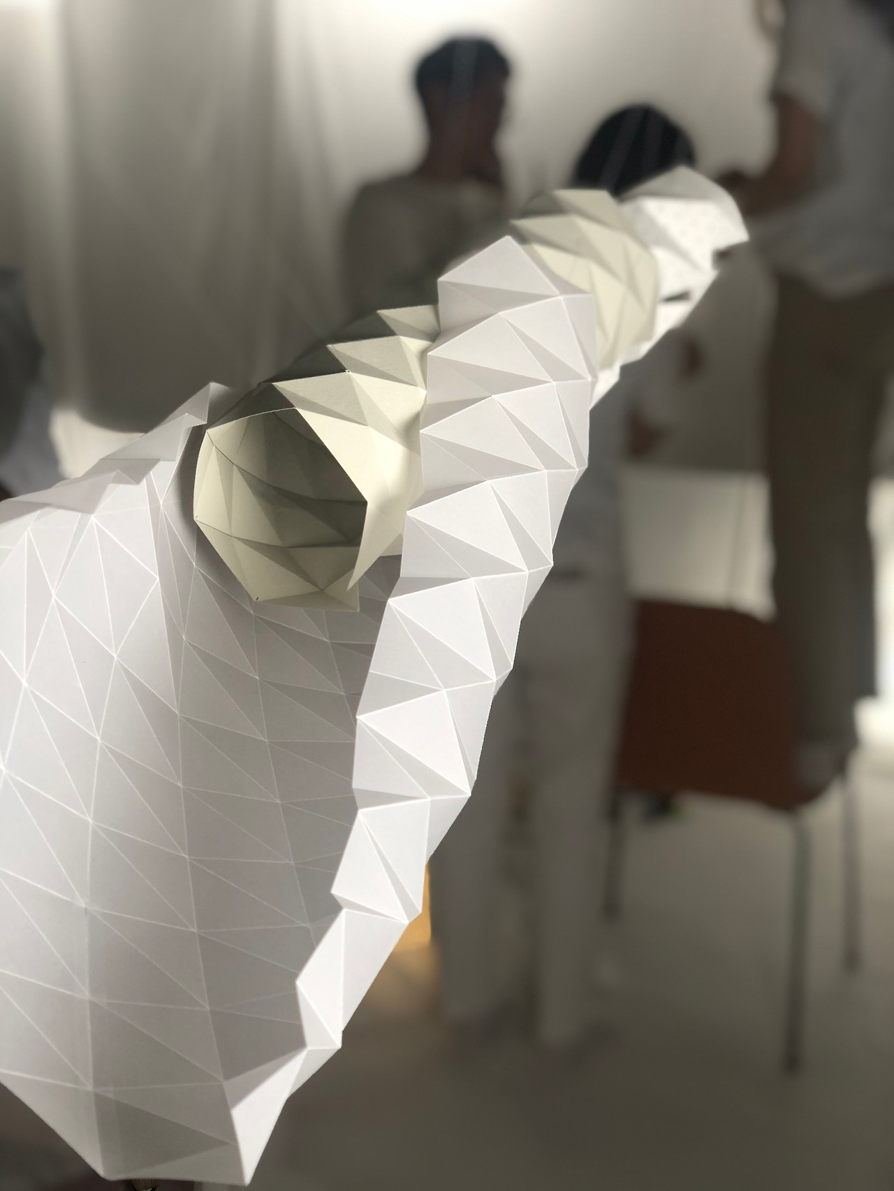 각각의 종이는 라니야(Tale3)와 핫산(Tale1)을 의미합니다. 라니야는 핫산의 아내로 중년의 라니야와 노년의 라니야는 합심하여 과거로 돌아가 위기에 빠진 젊은 핫산을 구합니다. 라니야가 시간여행을 하며 핫산의 삶에 영향을 미치며 서로 복잡하게 얽혀있었던 것처럼 구조물도 복잡하게 얽혀있도록 설계했습니다. 여기서는 넓었던 종이의 간격이 점차 좁아지는 방식을 이용하여 시간의 유속 변화를 표현했습니다.