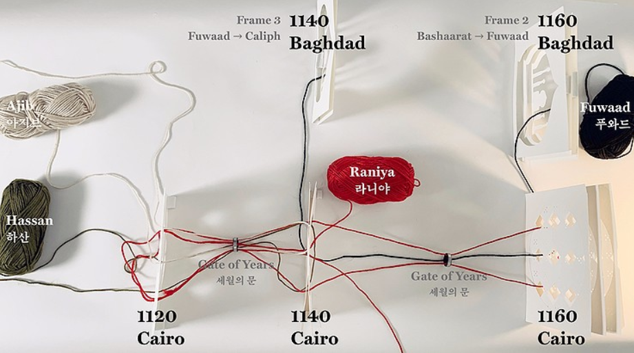 시간과 공간구조 팀은 소설 속 배경인 바그다드와 카이로, 그리고 20년의 기간을 두고 일어나는 각각의 사건들을 표현했습니다.