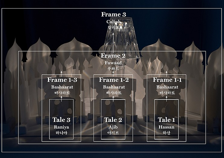Frame 3(푸와드-칼리프) 레벨은 3중 액자구성 중 가장 밖의 이야기이므로 성채의 외벽과 같이 표현하고, Frame 2(푸와드-바샤라트) 레벨은 중간의 이야기이므로 성채 내의 건물의 형태로 표현했으며, Frame 1(각각의 이야기) 레벨은 각각의 인물들의 이야기를 바샤라트를 통해 듣는 것이므로 건물 내부 느낌으로 표현, Tale 레벨은 건물 안의 방과 같은 느낌이 들도록 설계했습니다.