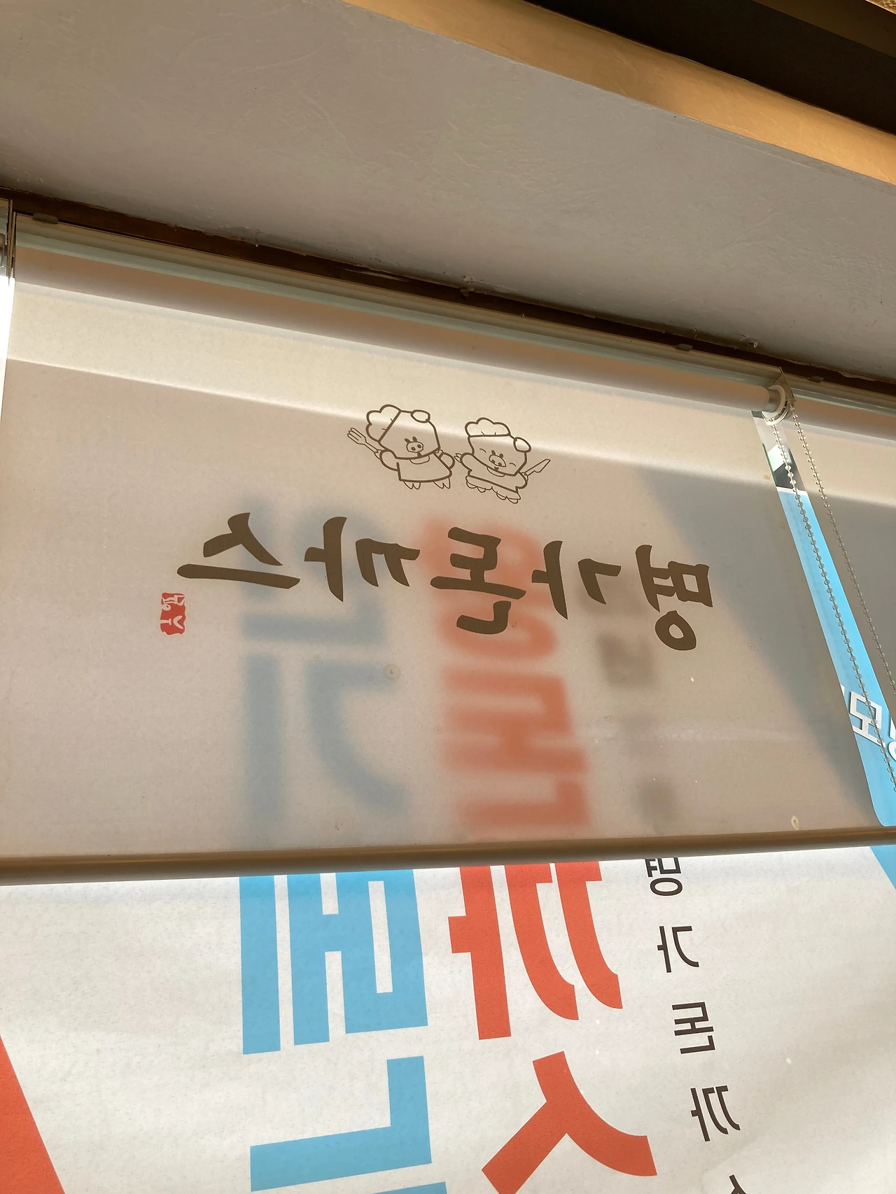 식사 중에 창밖에 설치된 블라인드를 보게 되었는데 돼지 캐릭터가 포크와 칼을 들고 돈까스 집을 홍보하고 있는 모양새가 제법 우스웠다.
