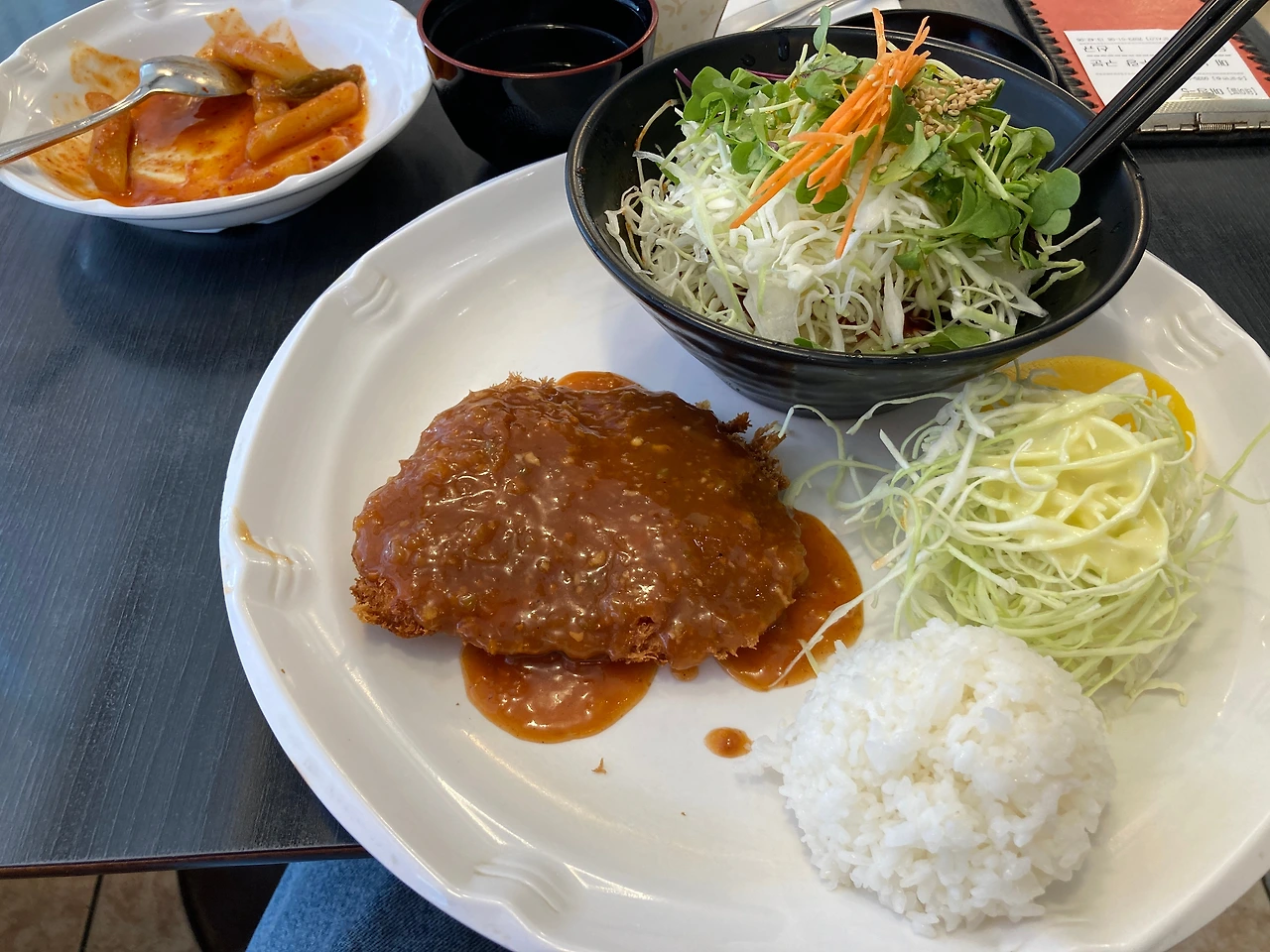 돈까스 한 덩이와 신선한 야채가 얹어진 쫄면, 길게 채 썬 양배추, 안 먹으면 조금은 아쉬운 한 스쿱 정도의 쌀밥까지 세트메뉴답게 적절한 구성이 좋았다.