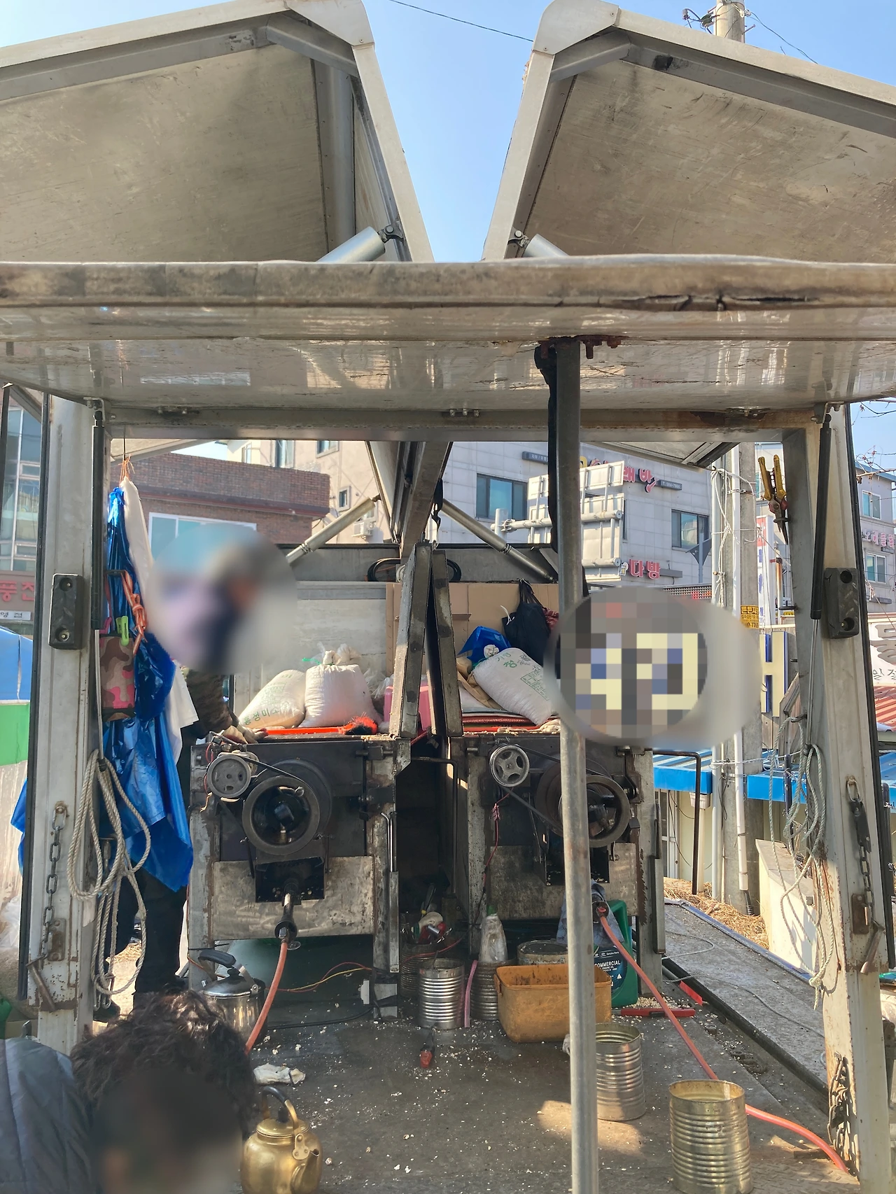 동네 어르신들이 각자 튀길 것을 가져와 은색 통 앞에 줄 세워놓았다. 눈치껏 각자의 곡물들을 줄 세우기 한 뒤 트럭 주변에서 본인들의 먹거리가 제대로 잘 튀겨지는지 확인하셨다.