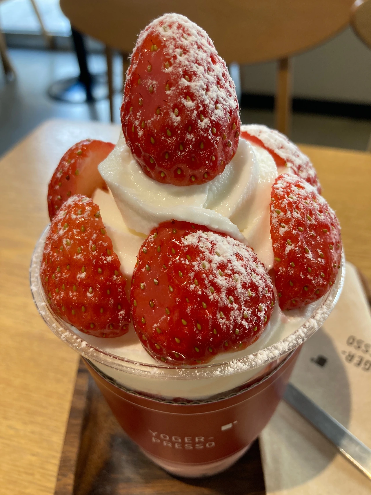 빨간 딸기 위에 슈가파우더까지 뿌려져서 마치 딸기밭에 눈이 내린 것 같았다. 한 입 맛보고는 감탄이 나왔다. 과일을 별로 좋아하진 않지만 음료나 와플에 들어간 딸기는 못 참는다.