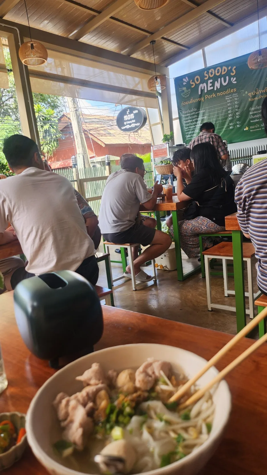 매콤한 국수를 주문하고 기다렸지만 시간이 15분 이상 걸린다며 다른 메뉴를 추천하는 젊은 청년에게 가장 기본이 되는 돼지고기 베이스의 맑은 국물의 국수를 주문했다. 가격은 60바트(2500원)다