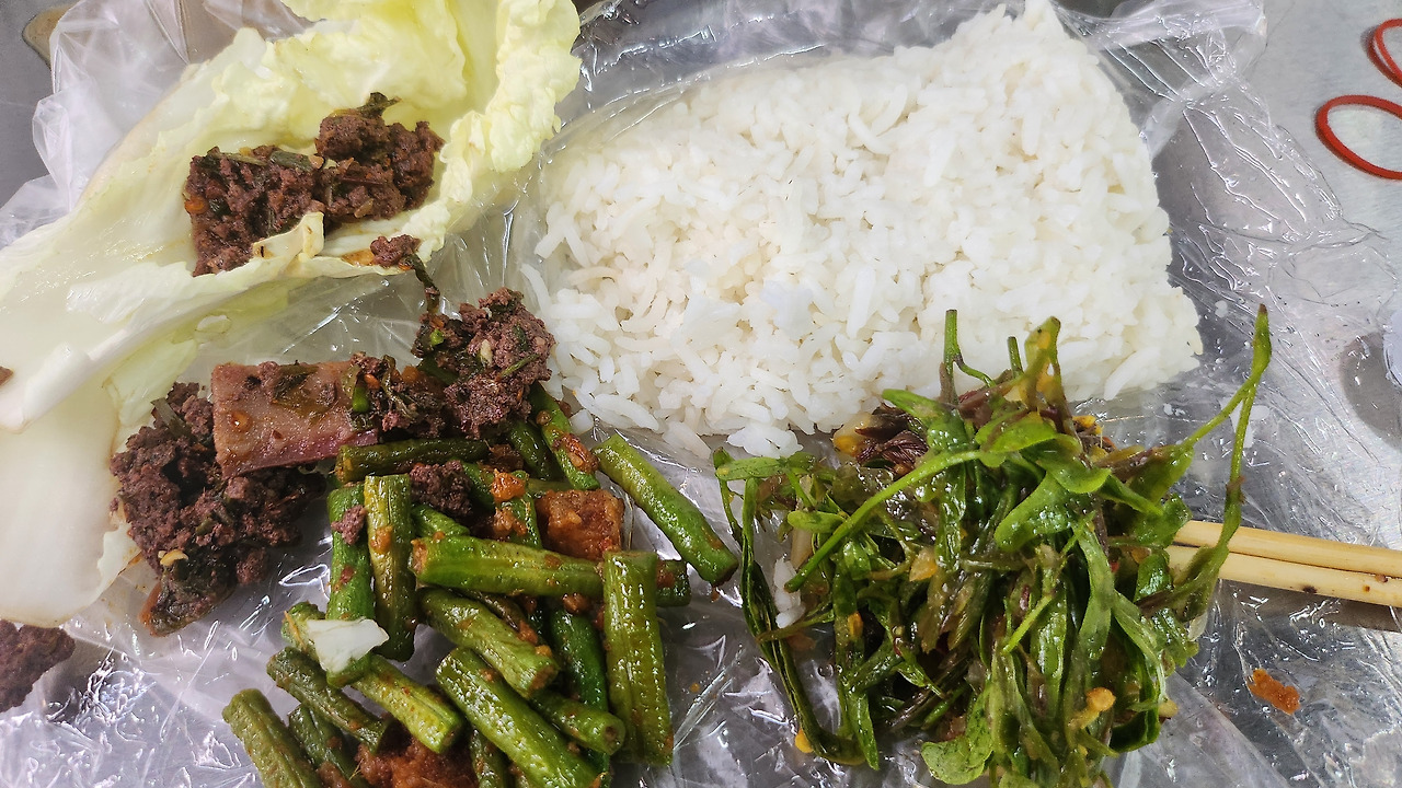 신기한 것이 나름 전문화되어 있어 한 가게에서는 김이 풀풀 나는 하얀 쌀밥, 흑미 찹쌀밥을 팔고 있었고, 다른 한쪽에서는 밥에 먹을 우리로 말하면 반찬들, 나물무침이며 고기 조림이며 생선 구이를 팔고 있었다.