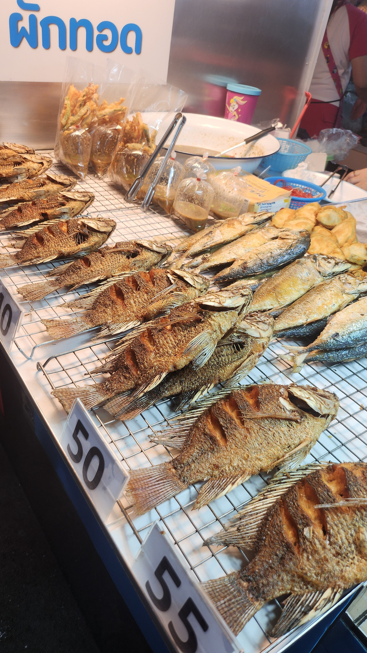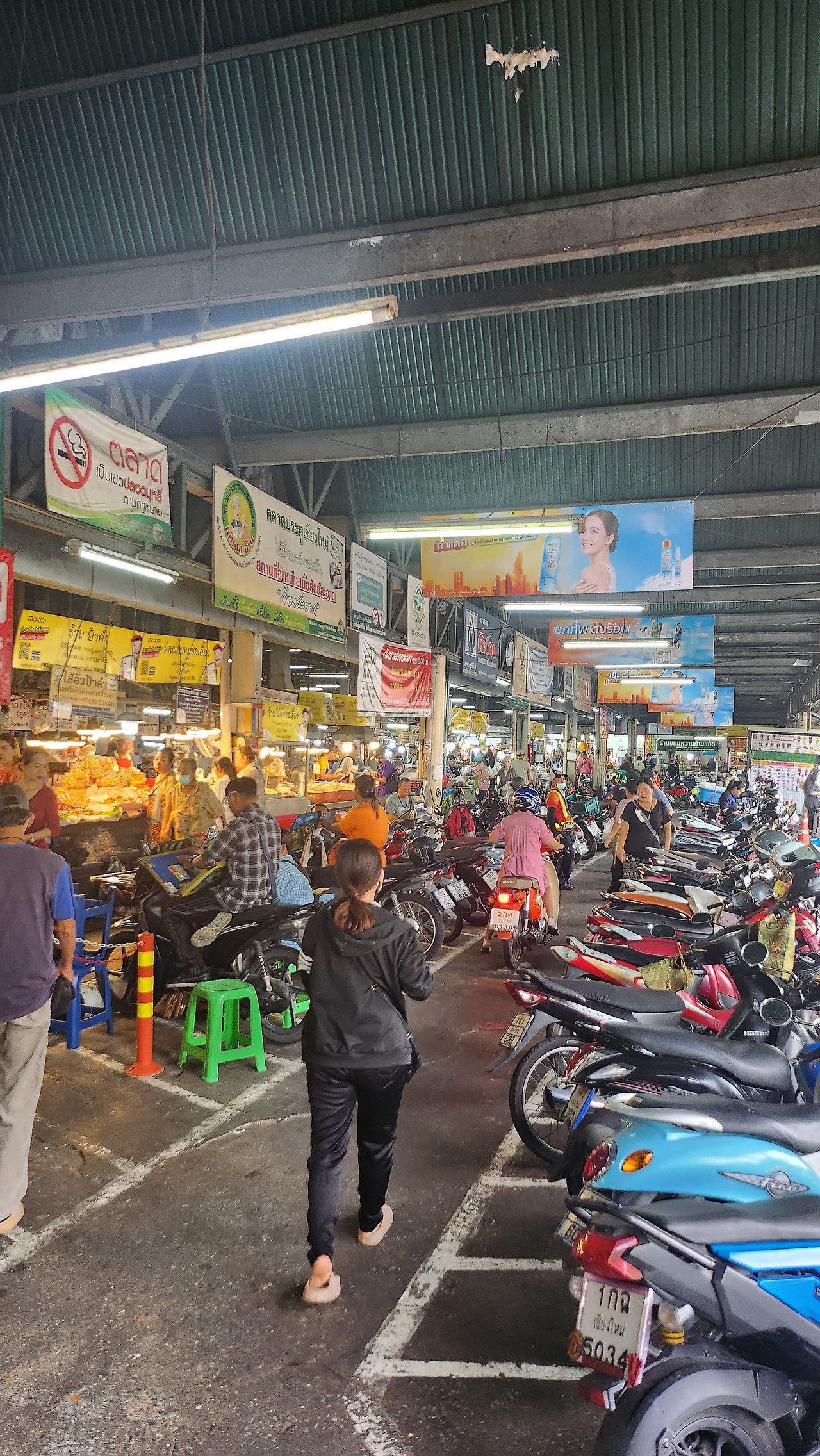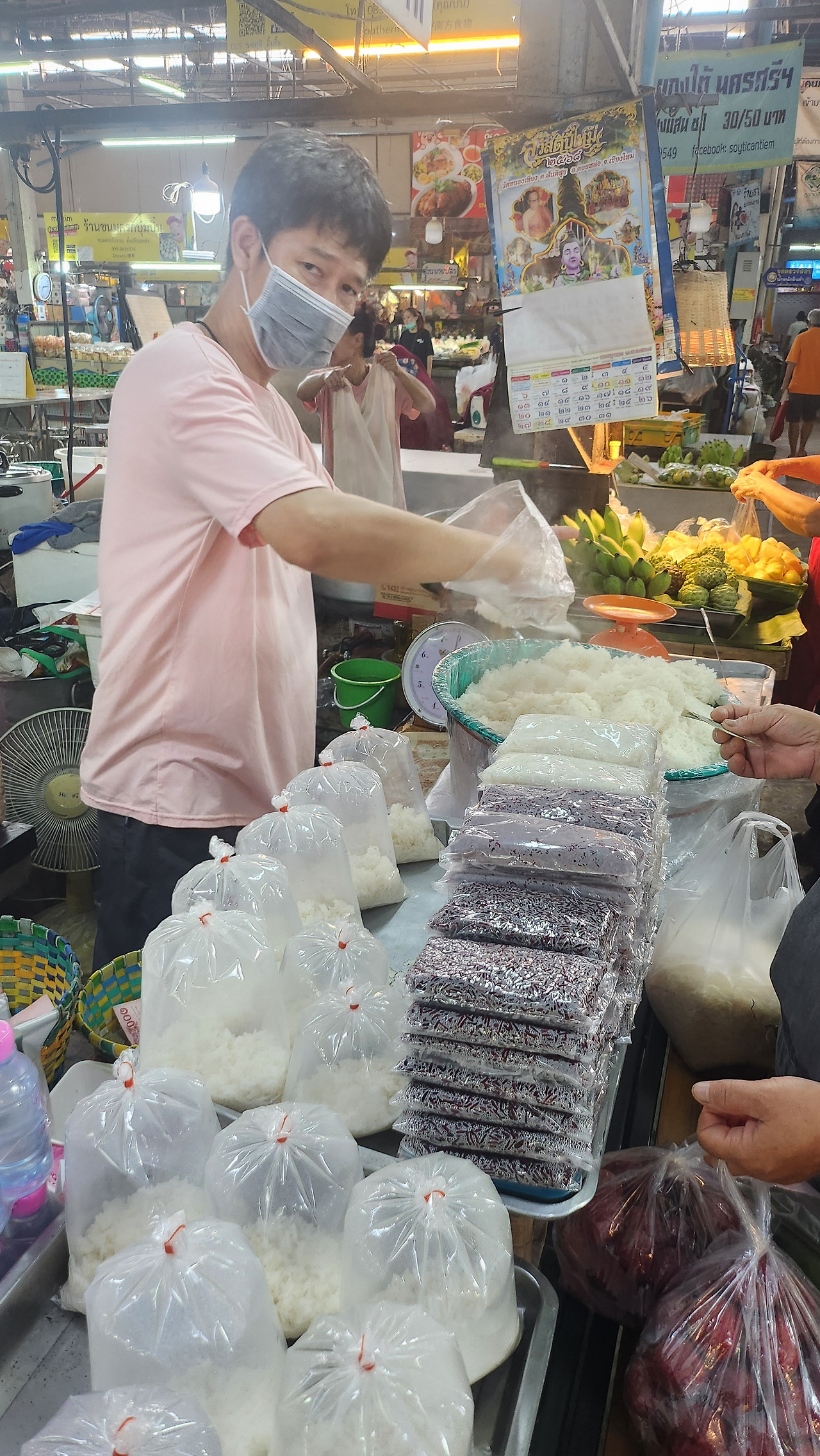시장 한쪽에 있는 공용 테이블로 가서 비닐 포장지를 깔고 그 위에 밥과 반찬을 올려놓고 태국 현지인들처럼 그들의 옆자리에 앉아 아침을 먹었다.