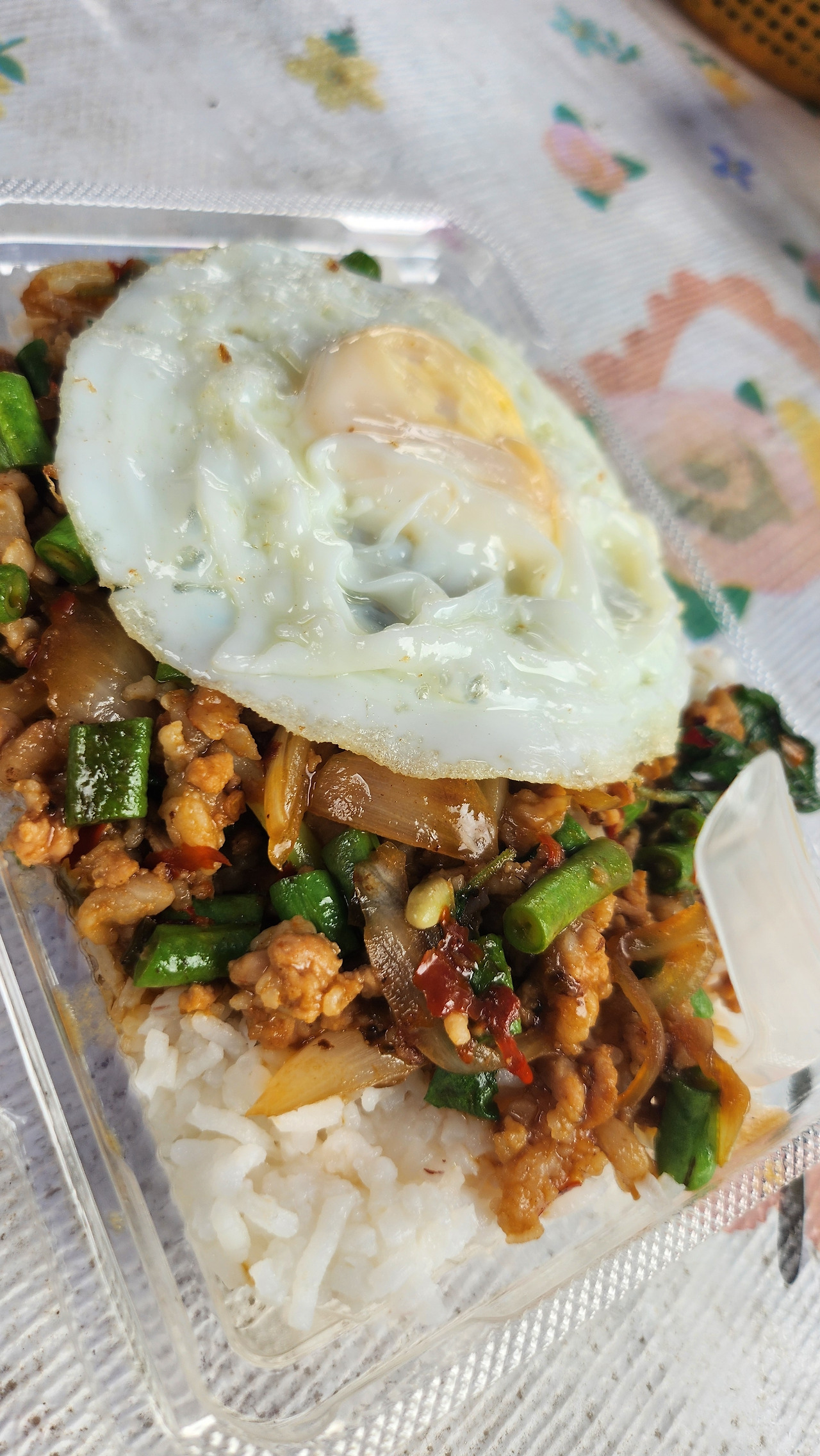 그 음식의 이름은 "카우 까파오 무쌉"(매운 다진 돼지고기 바질 덮밥)으로 태국인들의