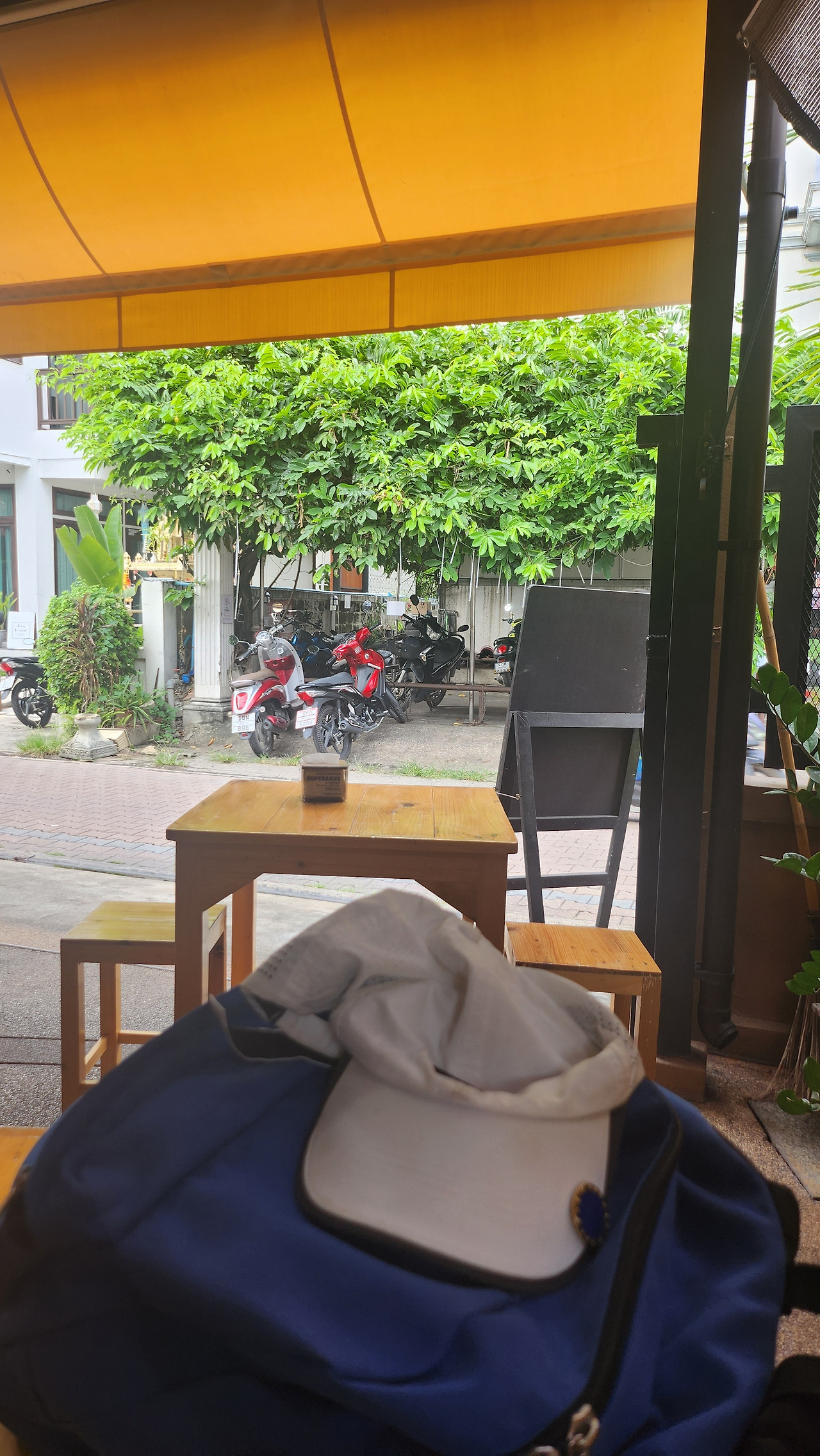 야외 테라스가 있는 노랑 감성의 카페에 앉아 우아하게 여유롭게 단아한 골목길을 바라보며 실패한 아침 국수에 처절한 복수를 해주었다.