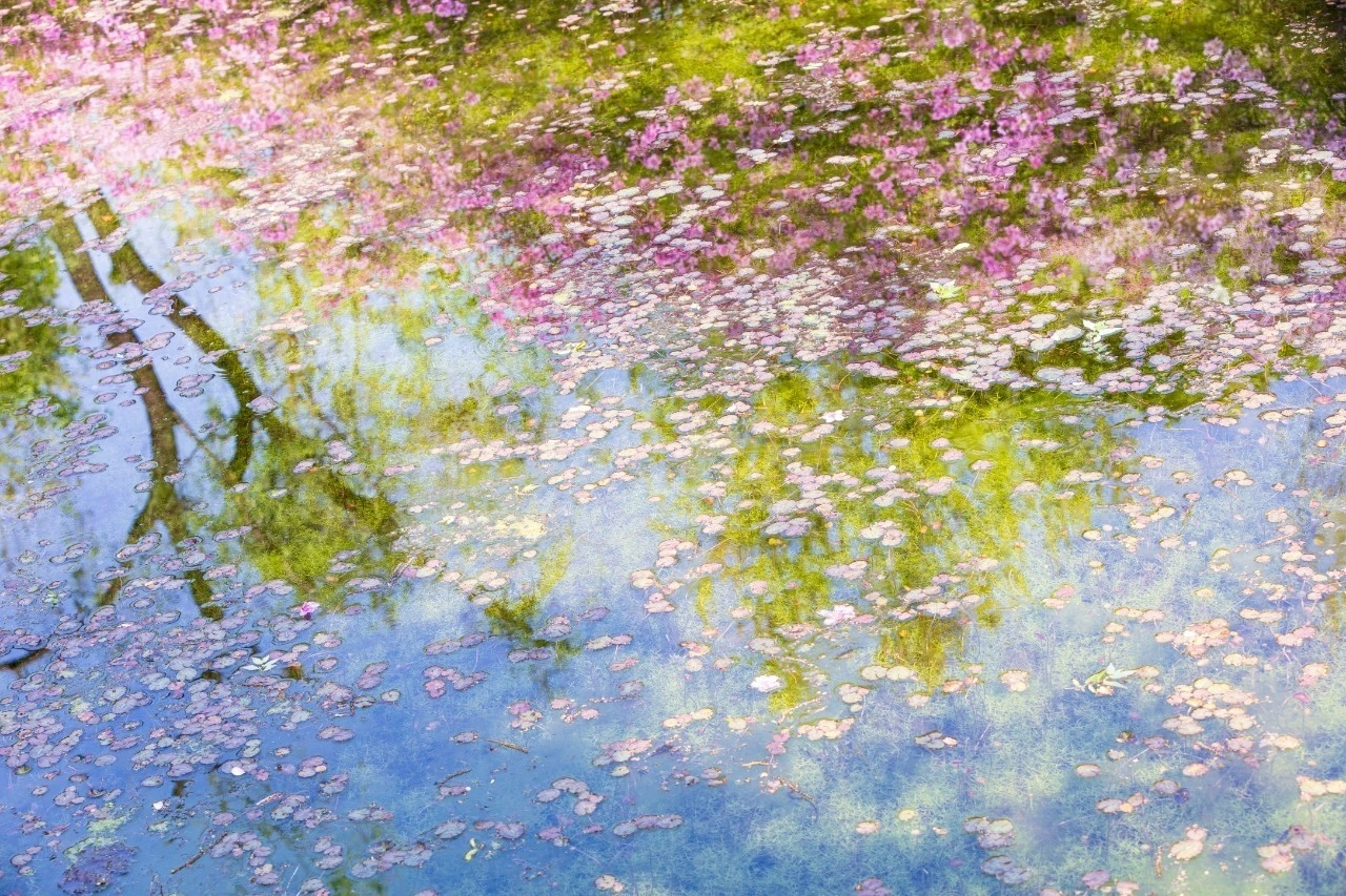 그림자와 꽃잎이 겹쳐진 연못 속, 내 마음도 그처럼 잠시 떠다녔다.