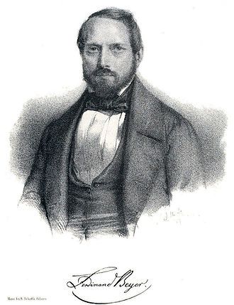 본명은 페르디난트 바이엘, 1803년에 태어나 1863년에 생을 마감한 독일의 작곡가이자 피아니스트입니다. 우리가 알고 있는 바이엘 교본의 원 제목은 Vorschule im Klavierspiel op. 101 직역해보자면 피아노의 기초 입문서쯤 되겠네요. 본 교재의 서문에는 이렇게 쓰여 있습니다. "이 작품은 피아노 연주자를 가능한 한 가장 쉽게 피아노 연주의 아름다움으로 안내해주려는 목적을 가지고 있습니다. 어린 아이들을 위한 작품이며, 많은 곡을 치지 않고도 단계적으로 진보할 수 있도록 하였습니다. 본격적인 수업을 시작하기 전 1-2년 동안 충분한 수업 재료로 사용될 수 있습니다."
