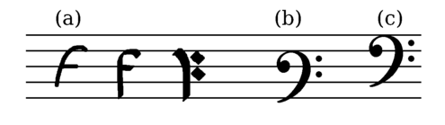 낮은 음자리표의 경우, 이런 순서대로 변화해왔습니다. 알파벳 F 모양과 비슷하다고 해서 독일어로는 F Schlüssel이라고 하기도 합니다. 여기 이 선에 위치한 음이 F-파라는 뜻이죠.