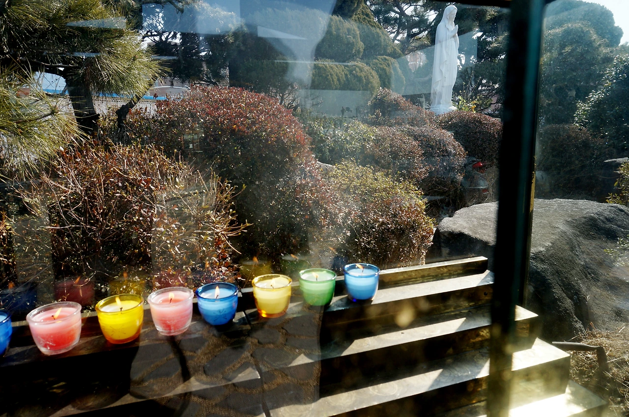초를 붙이는 곳이 있어 엄마와 나는 파란색 초 하나를 사 불을 붙였다.
